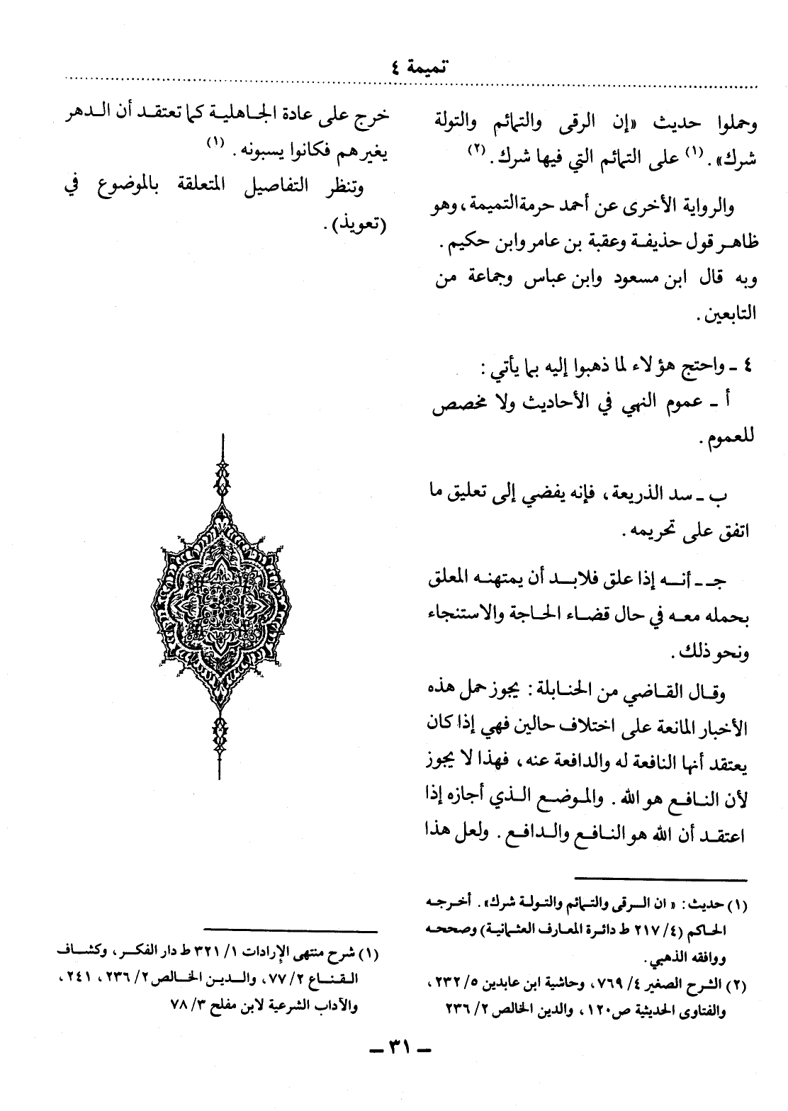 (1) حديث: " إن الرقى والتمائم والتولة شرك ". أخرجه الحاكم (4 / 217 ط دائرة المعارف العثمانية) وصححه ووافقه الذهبي.