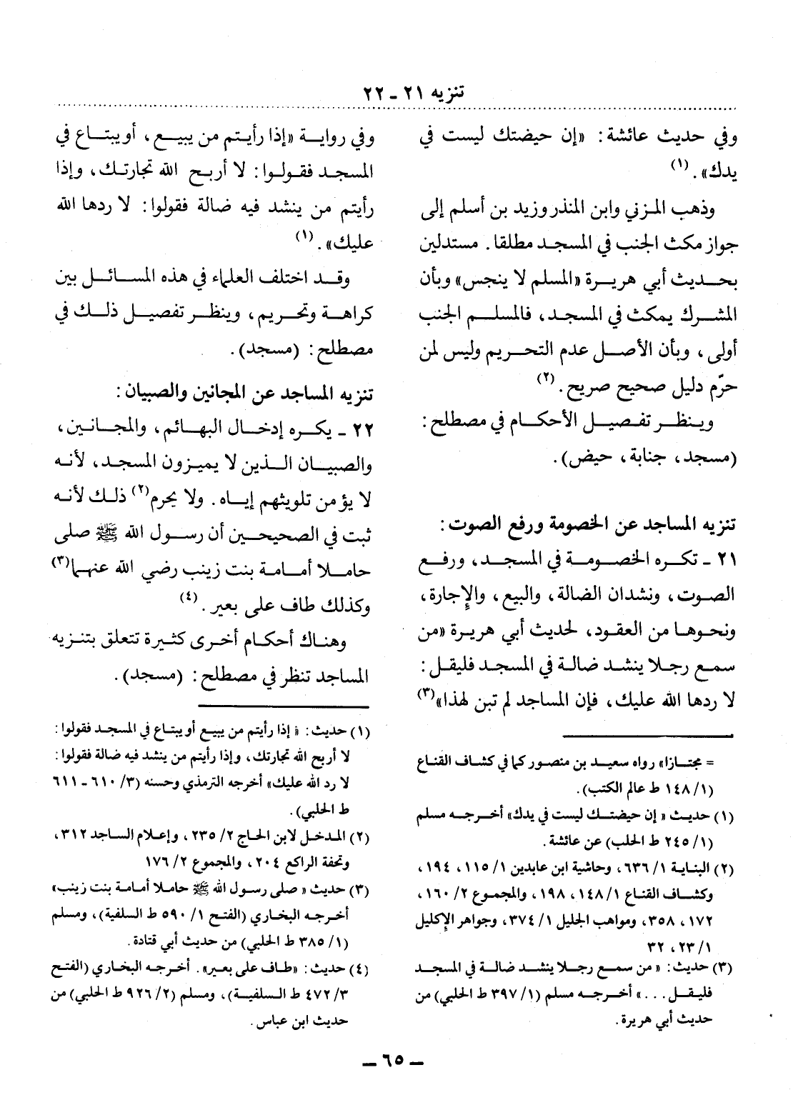 21 - تُكْرَهُ الْخُصُومَةُ فِي الْمَسْجِدِ، وَرَفْعُ الصَّوْتِ، وَنِشْدَانُ الضَّالَّةِ، وَالْبَيْعُ، وَالإِْجَارَةُ، وَنَحْوُهَا مِنَ الْعُقُودِ، لِحَدِيثِ أَبِي هُرَيْرَةَ مَنْ سَمِعَ رَجُلاً يَنْشُدُ ضَالَّةً فِي الْمَسْجِدِ فَلْيَقُل: لاَ رَدَّهَا اللَّهُ عَلَيْك، فَإِنَّ الْمَسَاجِدَ لَمْ تُبْنَ لِهَذَا (3)