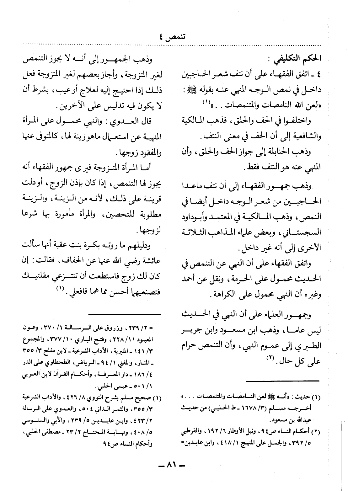 (2) أحكام النساء ص94، ونيل الأوطار 6 / 192، والقرطبي 5 / 392، والجمل على المنهج 1 / 418، وابن عابدين 2 / 239، وزرق على الرسالة 1 / 370، وعون المعبود 11 / 228، وفتح الباري 10 / 377، والمجموع 3 / 141 - النيرية، الآداب الشرعية لابن مفلح 3 / 355 - النار، والمغني 1 / 94 - الرياض، الطحطاوي على الدر 4 / 186 - دار المعرفة، وأحكام القرآن لابن العربي 1 / 501 - عيسى الحلبي.