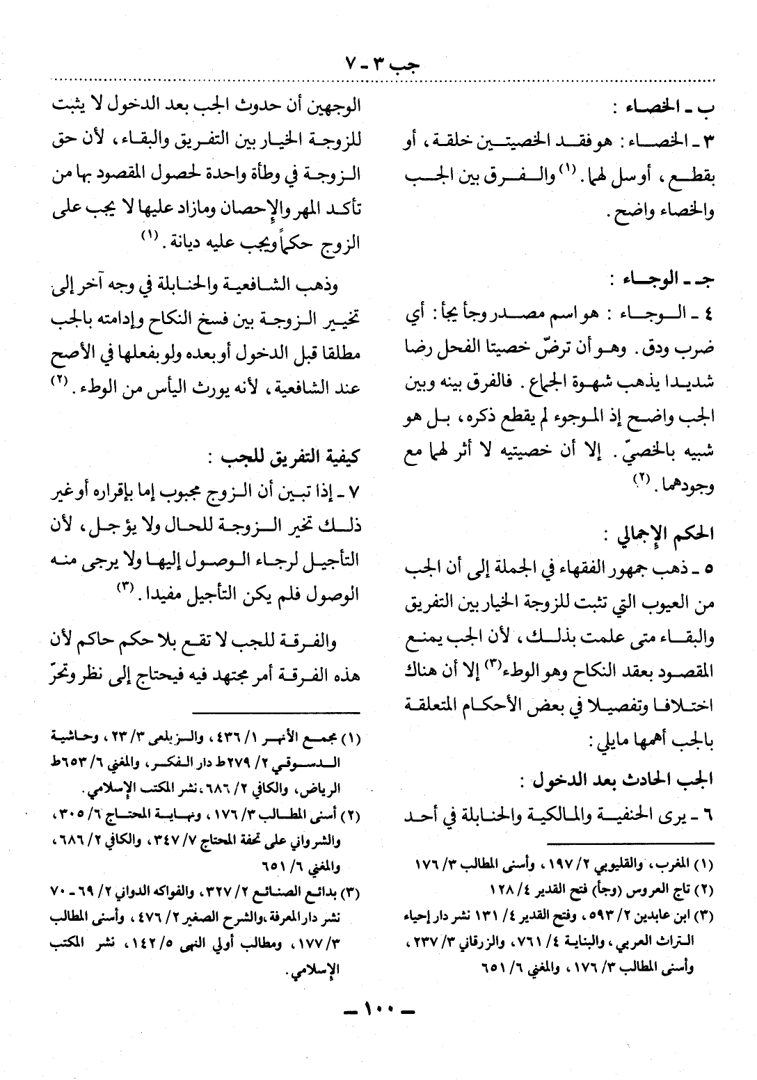 5 - ذَهَبَ جُمْهُورُ الْفُقَهَاءِ فِي الْجُمْلَةِ إِلَى أَنَّ الْجَبَّ مِنَ الْعُيُوبِ الَّتِي تُثْبِتُ لِلزَّوْجَةِ الْخِيَارَ بَيْنَ التَّفْرِيقِ وَالْبَقَاءِ مَتَى عَلِمَتْ بِذَلِكَ؛ لأَِنَّ الْجَبَّ يَمْنَعُ الْمَقْصُودَ بِعَقْدِ النِّكَاحِ وَهُوَ الْوَطْءُ (3) إِلاَّ أَنَّ هُنَاكَ اخْتِلاَفًا وَتَفْصِيلاً فِي بَعْضِ الأَْحْكَامِ الْمُتَعَلِّقَةِ بِالْجَبِّ أَهَمُّهَا مَا يَلِي: