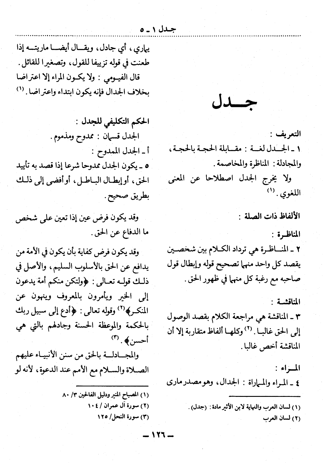1 - الْجَدَل لُغَةً: مُقَابَلَةُ الْحُجَّةِ بِالْحُجَّةِ، وَالْمُجَادَلَةُ: الْمُنَاظَرَةُ وَالْمُخَاصَمَةُ