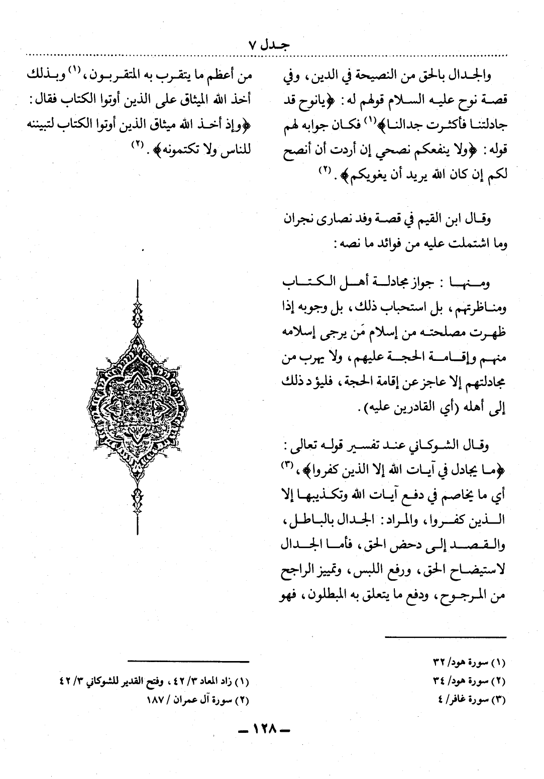 وَمِنْهَا: جَوَازُ مُجَادَلَةِ أَهْل الْكِتَابِ وَمُنَاظَرَتِهِمْ، بَل اسْتِحْبَابُ ذَلِكَ، بَل وُجُوبُهُ إِذَا ظَهَرَتْ مَصْلَحَتُهُ مِنْ إِسْلاَمِ مَنْ يُرْجَى إِسْلاَمُهُ مِنْهُمْ وَإِقَامَةِ الْحُجَّةِ عَلَيْهِمْ، وَلاَ يَهْرُبُ مِنْ مُجَادَلَتِهِمْ إِلاَّ عَاجِزٌ عَنْ إِقَامَةِ الْحُجَّةِ، فَلْيُؤَدِّ ذَلِكَ إِلَى أَهْلِهِ (أَيِ الْقَادِرِينَ عَلَيْهِ) .