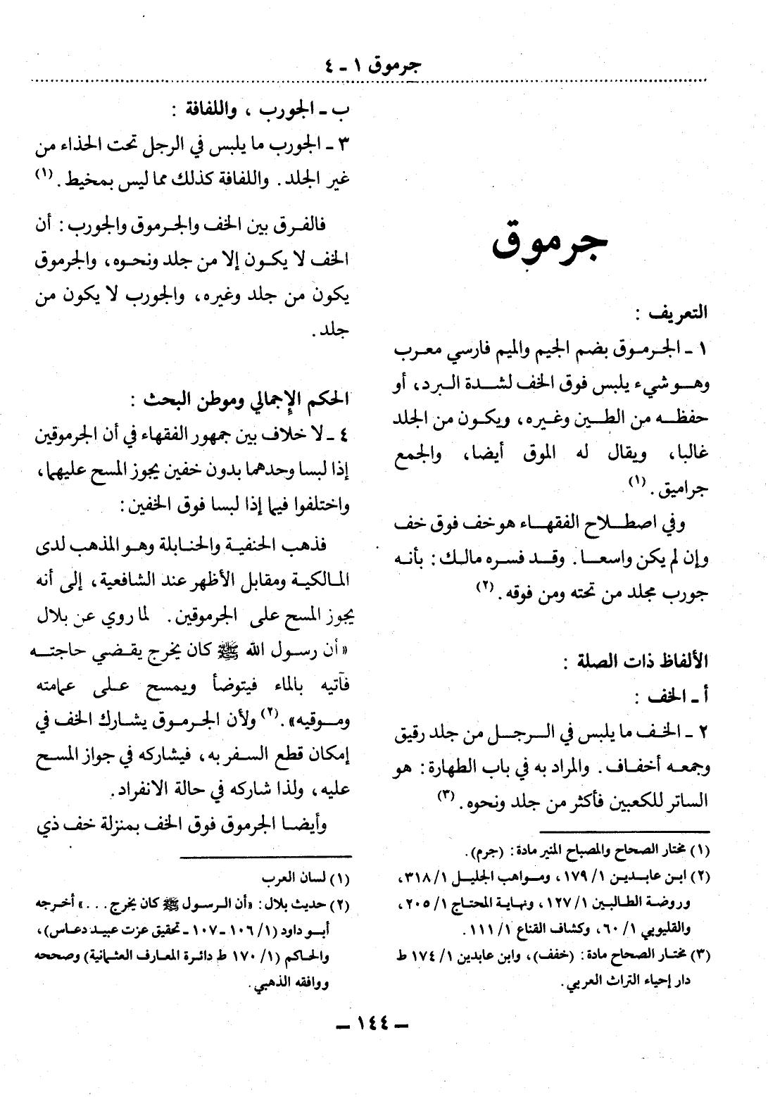3 - الْجَوْرَبُ مَا يُلْبَسُ فِي الرِّجْل تَحْتَ الْحِذَاءِ مِنْ غَيْرِ الْجِلْدِ. وَاللِّفَافَةُ كَذَلِكَ مِمَّا لَيْسَ بِمَخِيطٍ (1) .