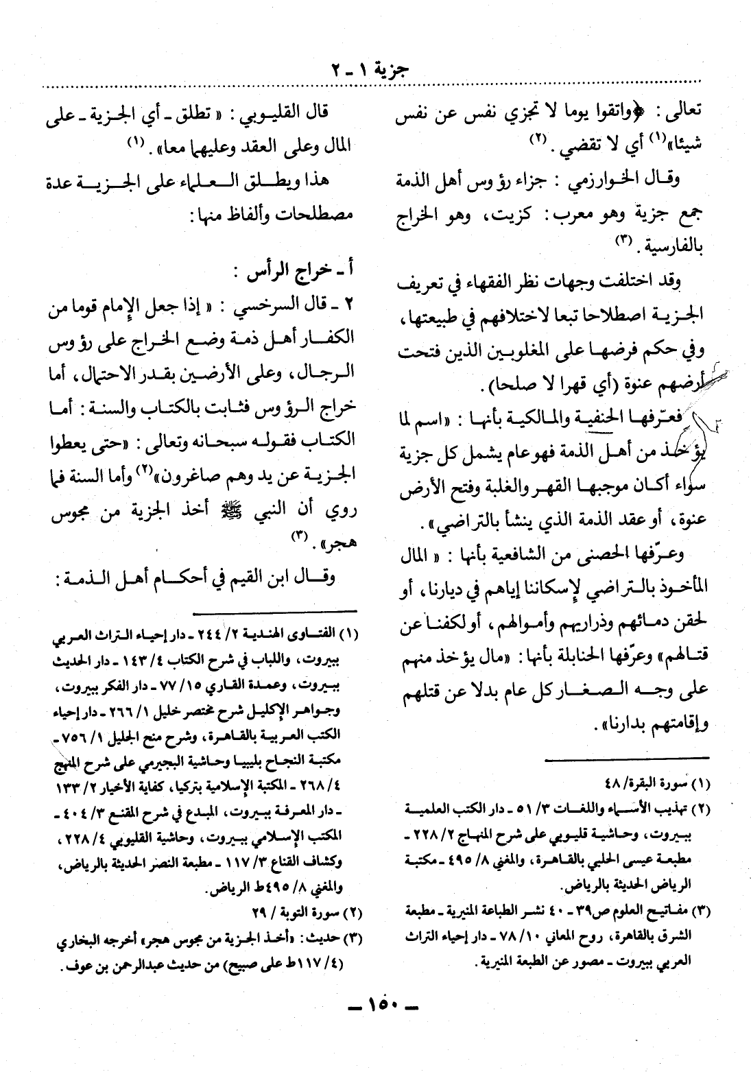 2 - قَال السَّرَخْسِيُّ: " إِذَا جَعَل الإِْمَامُ قَوْمًا مِنَ الْكُفَّارِ أَهْل ذِمَّةٍ وَضَعَ الْخَرَاجَ عَلَى رُءُوسِ الرِّجَال، وَعَلَى الأَْرَضِينَ بِقَدْرِ الاِحْتِمَال، أَمَّا خَرَاجُ الرُّءُوسِ فَثَابِتٌ بِالْكِتَابِ وَالسُّنَّةِ: أَمَّا الْكِتَابُ فَقَوْلُهُ سُبْحَانَهُ وَتَعَالَى: {حَتَّى يُعْطُوا الْجِزْيَةَ عَنْ يَدٍ وَهُمْ صَاغِرُونَ (2) } وَأَمَّا السُّنَّةُ فَمَا رُوِيَ أَنَّ النَّبِيَّ أَخَذَ الْجِزْيَةَ مِنْ مَجُوسِ هَجَرَ (3) .