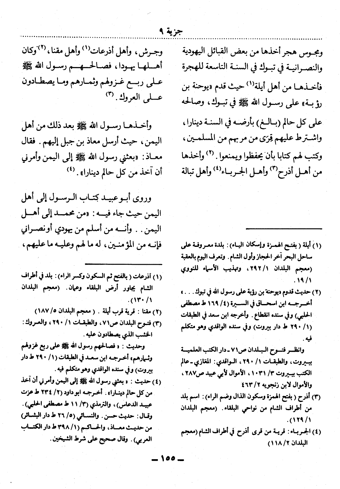 (2) حديث قدوم " يوحنة بن رؤبة على رسول الله في تبوك. . . " أخرجه ابن إسحاق في السيرة (4 / 169 ط مصطفى الحلبي) وفي سنده انقطاع. وأخرجه ابن سعد في الطبقات (1 / 290 ط دار بيروت) وفي سنده الواقدي وهو متكلم فيه. وانظر فتوح البلدان ص 71 - دار الكتب العلمية ببيروت، والطبقات 1 / 290، الواقدي: المغازي - عالم الكتب ببيروت 3 / 1031، والأموال لأبي عبيد ص 287، والأموال لابن زنجويه 2 / 463.