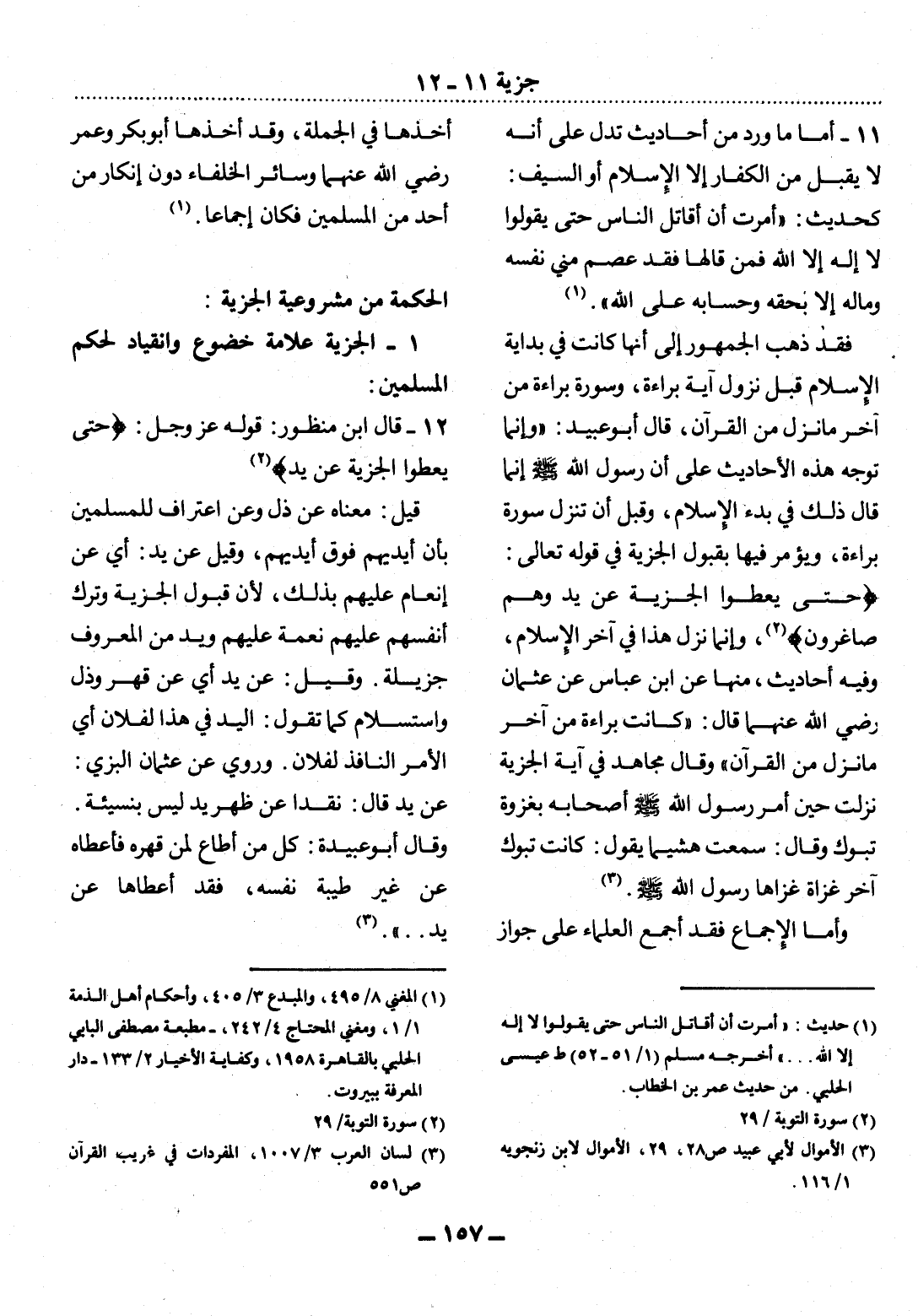 12 - قَال ابْنُ مَنْظُورٍ: قَوْلُهُ عَزَّ وَجَل: {حَتَّى يُعْطُوا الْجِزْيَةَ عَنْ يَدٍ (2) }