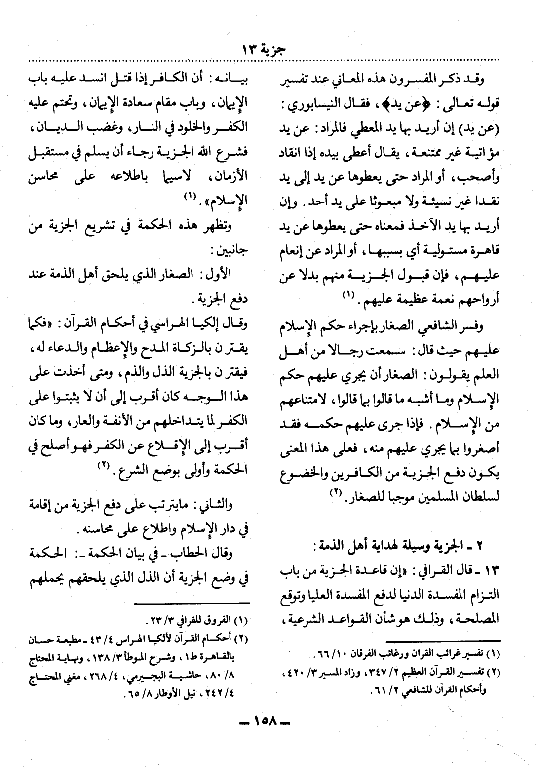 13 - قَال الْقَرَافِيُّ: " إِنَّ قَاعِدَةَ الْجِزْيَةِ مِنْ بَابِ الْتِزَامِ الْمَفْسَدَةِ الدُّنْيَا لِدَفْعِ الْمَفْسَدَةِ الْعُلْيَا وَتَوَقُّعِ الْمَصْلَحَةِ، وَذَلِكَ هُوَ شَأْنُ الْقَوَاعِدِ الشَّرْعِيَّةِ،