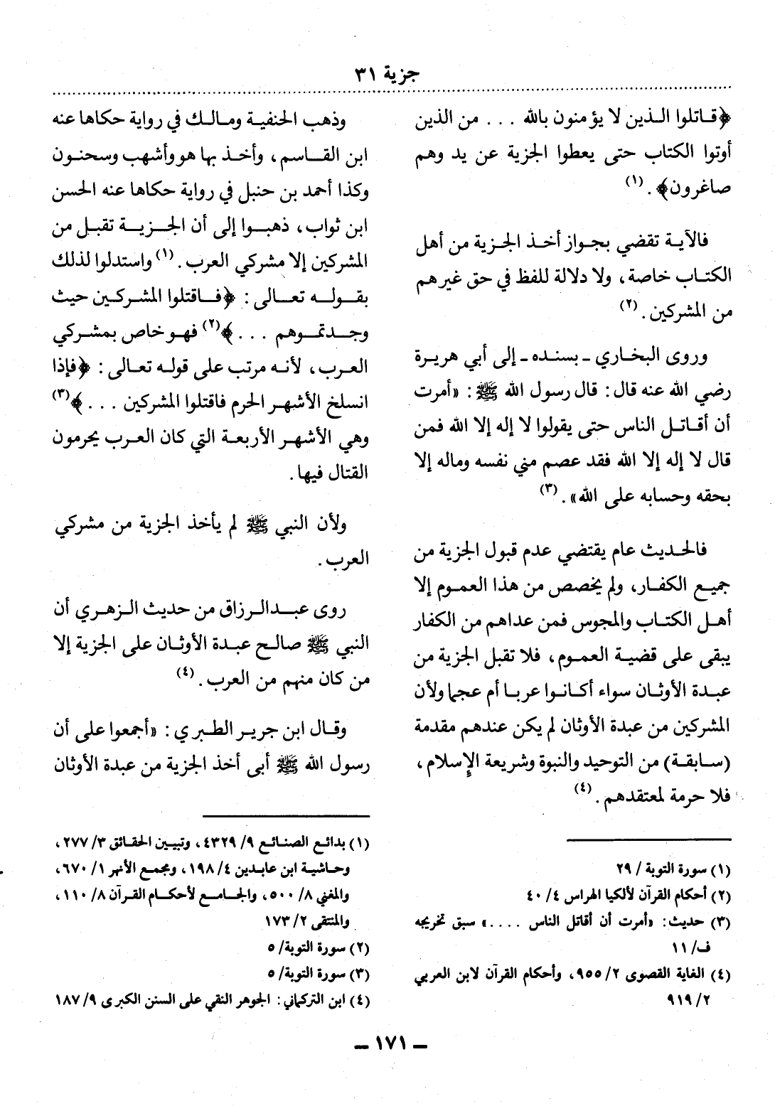 {قَاتِلُوا الَّذِينَ لاَ يُؤْمِنُونَ بِاللَّهِ} . {مِنَ الَّذِينَ أُوتُوا الْكِتَابَ حَتَّى يُعْطُوا الْجِزْيَةَ عَنْ يَدٍ وَهُمْ صَاغِرُونَ (1) } .