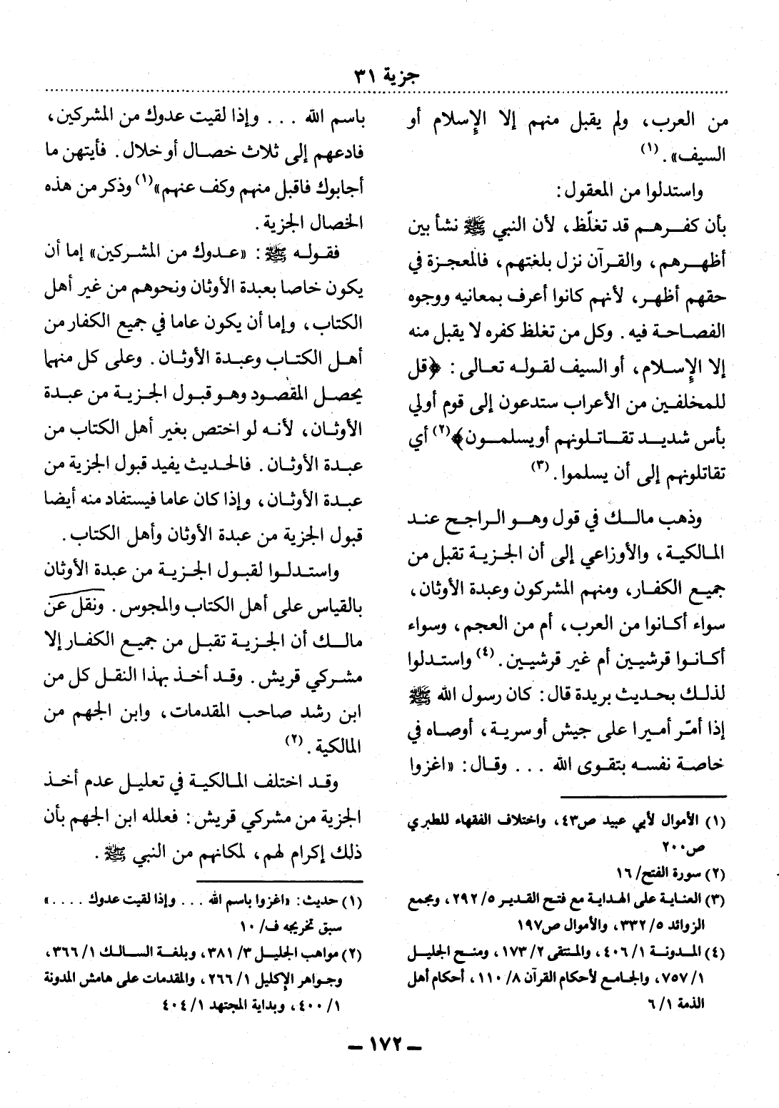 (4) المدونة 1 / 406، والمنتقى 2 / 173، ومنح الجليل 1 / 757، والجامع لأحكام القرآن 8 / 110، أحكام أهل الذمة 1 / 6.