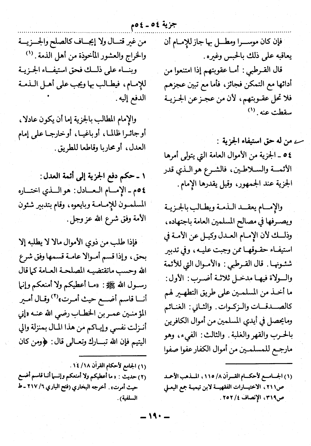 54 - الْجِزْيَةُ مِنَ الأَْمْوَال الْعَامَّةِ الَّتِي يَتَوَلَّى أَمْرَهَا الأَْئِمَّةُ وَالسَّلاَطِينُ، فَالشَّرْعُ هُوَ الَّذِي قَدَّرَ الْجِزْيَةَ عِنْدَ الْجُمْهُورِ، وَقِيل: يُقَدِّرُهَا الإِْمَامُ.