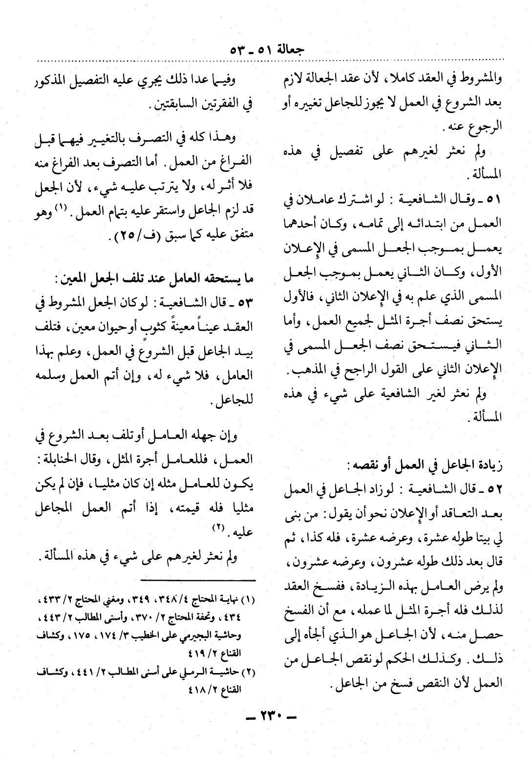 52 - قَال الشَّافِعِيَّةُ: لَوْ زَادَ الْجَاعِل فِي الْعَمَل بَعْدَ التَّعَاقُدِ أَوِ الإِْعْلاَنِ نَحْوُ أَنْ يَقُول: مَنْ بَنَى لِي بَيْتًا طُولُهُ عَشَرَةٌ، وَعَرْضُهُ عَشَرَةٌ، فَلَهُ كَذَا، ثُمَّ قَال بَعْدَ ذَلِكَ طُولُهُ عِشْرُونَ، وَعَرْضُهُ عِشْرُونَ، وَلَمْ يَرْضَ الْعَامِل بِهَذِهِ الزِّيَادَةِ، فَفَسَخَ الْعَقْدَ لِذَلِكَ فَلَهُ أُجْرَةُ الْمِثْل لِمَا عَمِلَهُ، مَعَ أَنَّ الْفَسْخَ حَصَل مِنْهُ؛ لأَِنَّ الْجَاعِل هُوَ الَّذِي أَلْجَأَهُ إِلَى ذَلِكَ. وَكَذَلِكَ الْحُكْمُ لَوْ نَقَصَ الْجَاعِل مِنَ الْعَمَل لأَِنَّ النَّقْصَ فَسْخٌ مِنَ الْجَاعِل.