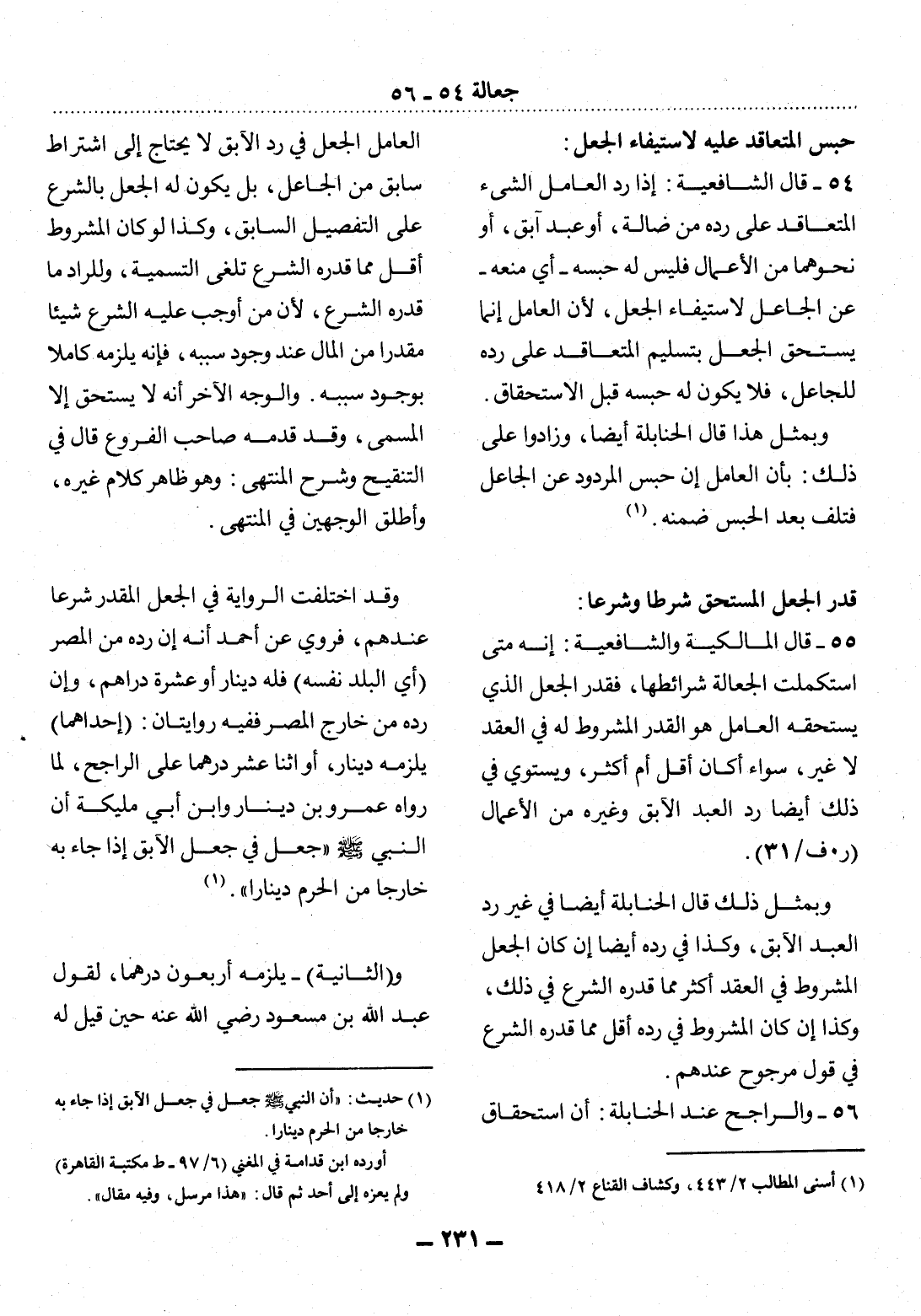 55 - قَال الْمَالِكِيَّةُ وَالشَّافِعِيَّةُ: إِنَّهُ مَتَى اسْتَكْمَلَتِ الْجِعَالَةُ شَرَائِطَهَا، فَقَدْرُ الْجُعْل الَّذِي يَسْتَحِقُّهُ الْعَامِل هُوَ الْقَدْرُ الْمَشْرُوطُ لَهُ فِي الْعَقْدِ لاَ غَيْرُ، سَوَاءٌ أَكَانَ أَقَل أَمْ أَكْثَرَ، وَيَسْتَوِي فِي ذَلِكَ أَيْضًا رَدُّ الْعَبْدِ الآْبِقِ وَغَيْرُهُ مِنَ الأَْعْمَال (ر. ف / 31) .