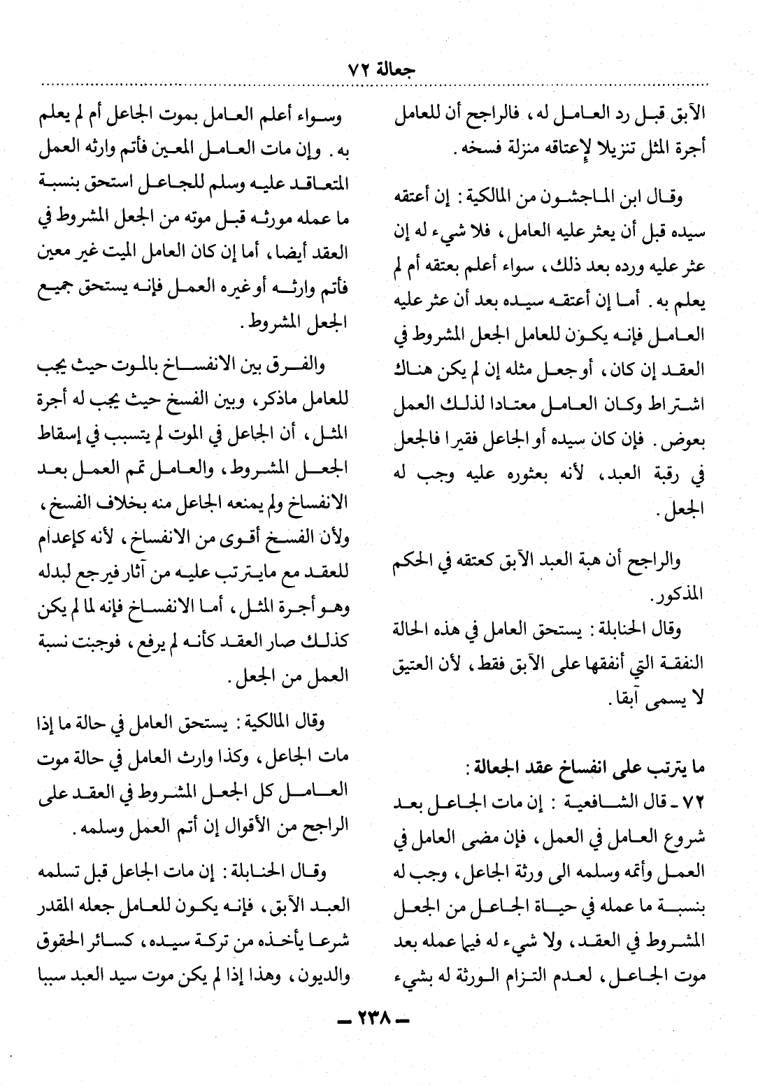 72 - قَال الشَّافِعِيَّةُ: إِنْ مَاتَ الْجَاعِل بَعْدَ شُرُوعِ الْعَامِل فِي الْعَمَل، فَإِنْ مَضَى الْعَامِل فِي الْعَمَل وَأَتَمَّهُ وَسَلَّمَهُ إِلَى وَرَثَةِ الْجَاعِل، وَجَبَ لَهُ بِنِسْبَةِ مَا عَمِلَهُ فِي حَيَاةِ الْجَاعِل مِنَ الْجُعْل الْمَشْرُوطِ فِي الْعَقْدِ، وَلاَ شَيْءَ لَهُ فِيمَا عَمِلَهُ بَعْدَ مَوْتِ الْجَاعِل؛ لِعَدَمِ الْتِزَامِ الْوَرَثَةِ لَهُ بِشَيْءٍ
