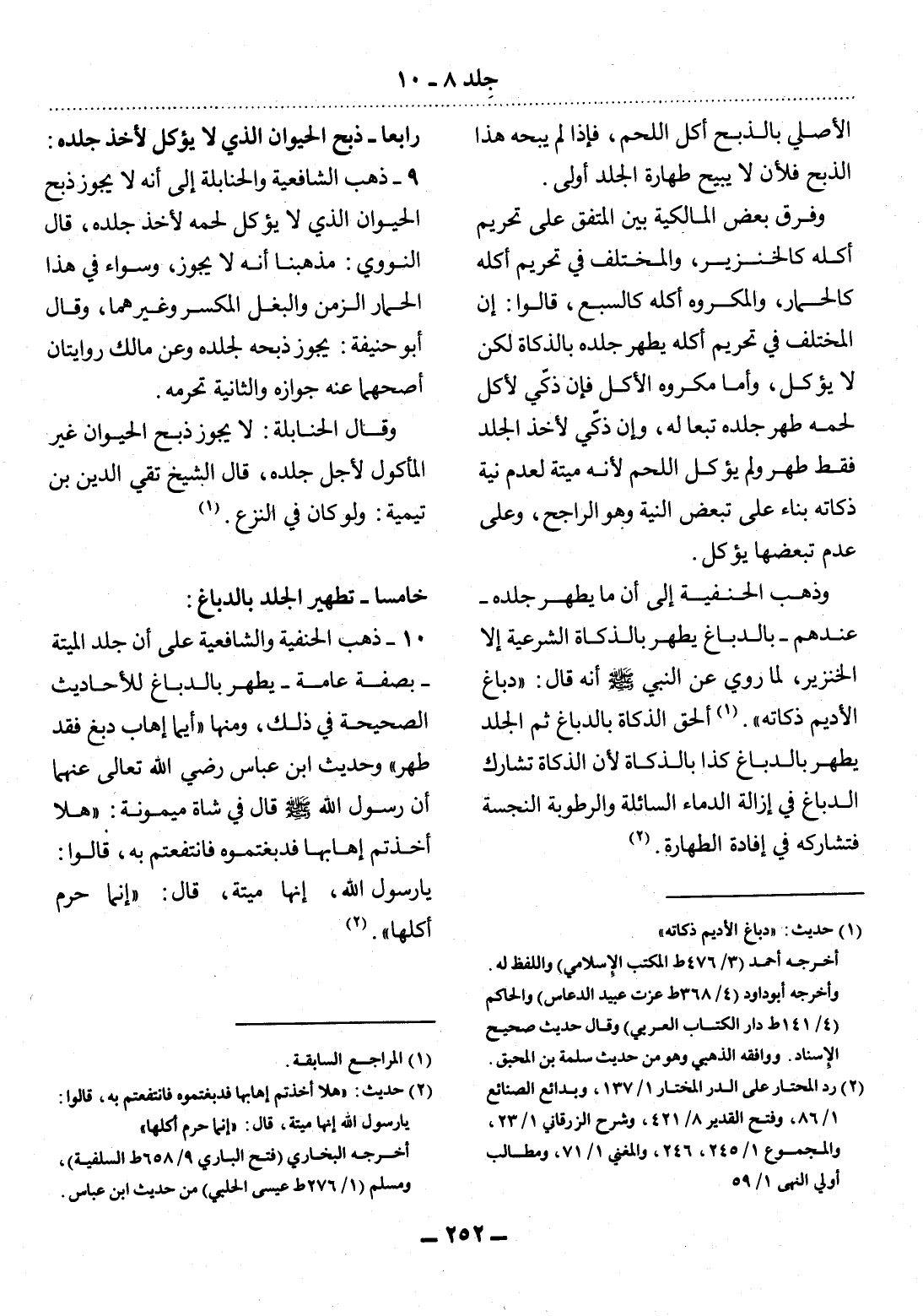 (2) حديث: " هلا أخذتم إهابها فدبغتموه فانتفعتم به "، قالوا: يا رسول الله إنها ميتة، قال: " إنما حرم أكلها " أخرجه البخاري (فتح الباري 9 / 658 ط السلفية) ، ومسلم (1 / 276 ط عيسى الحلبي) من حديث ابن عباس.