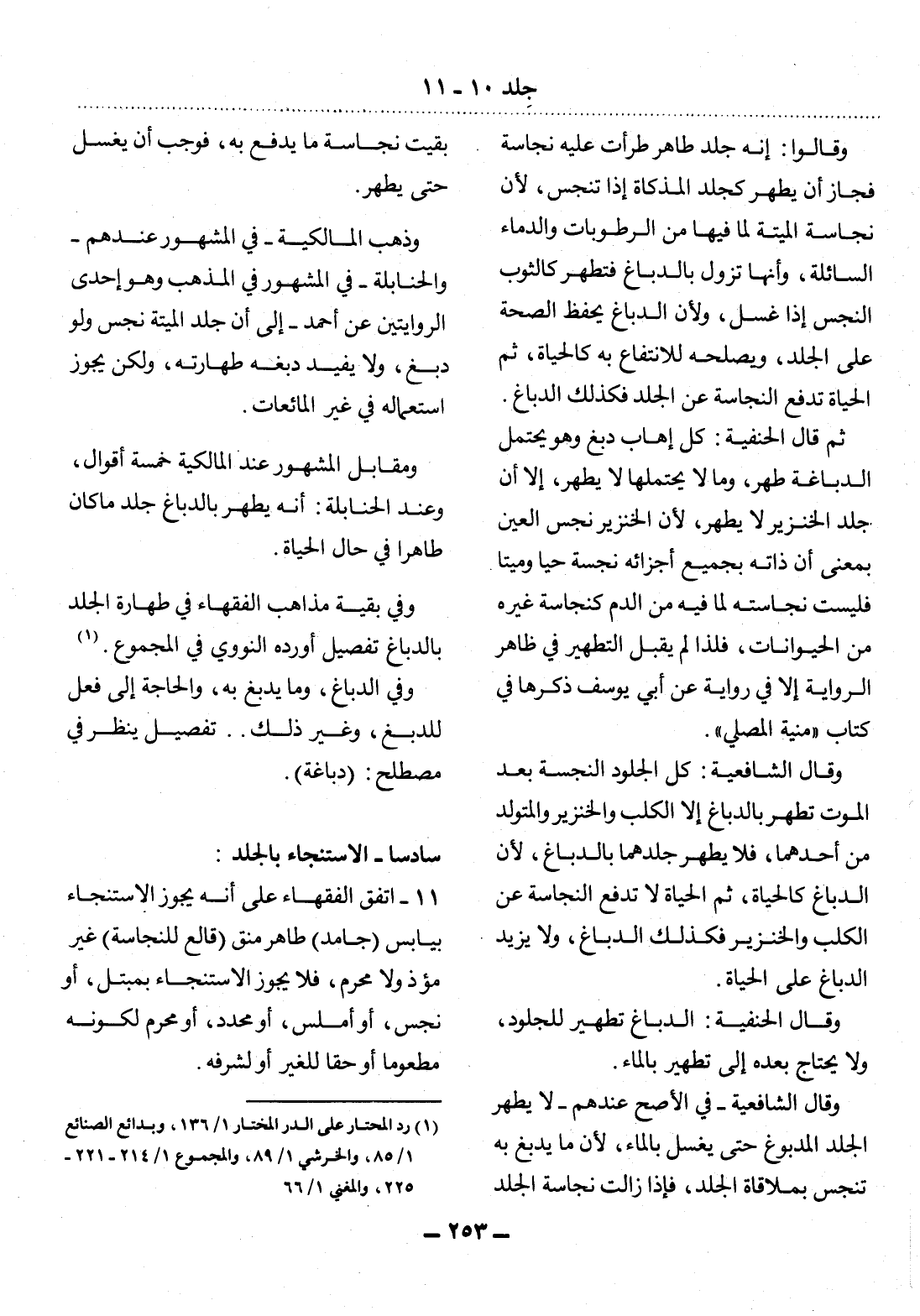 وَفِي بَقِيَّةِ مَذَاهِبِ الْفُقَهَاءِ فِي طَهَارَةِ الْجِلْدِ بِالدِّبَاغِ تَفْصِيلٌ أَوْرَدَهُ النَّوَوِيُّ فِي الْمَجْمُوعِ (1) .