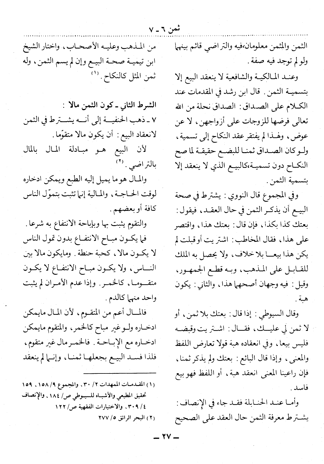 7 - ذَهَبَ الْحَنَفِيَّةُ إِلَى أَنَّهُ يُشْتَرَطُ فِي الثَّمَنِ لاِنْعِقَادِ الْبَيْعِ: أَنْ يَكُونَ مَالاً مُتَقَوِّمًا.