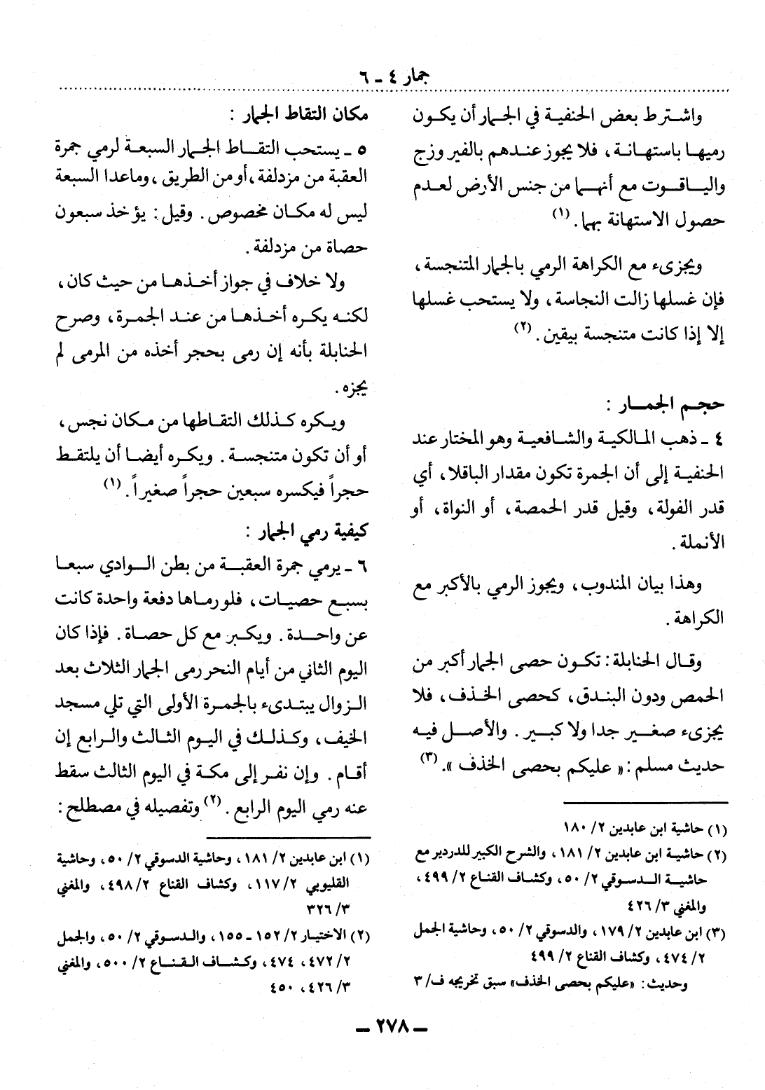 (3) ابن عابدين 2 / 179، والدسوقي 2 / 50، وحاشية الجمل 2 / 474، وكشاف القناع 2 / 499. وحديث: " عليكم بحصى الخذف " سبق تخريجه ف / 3.