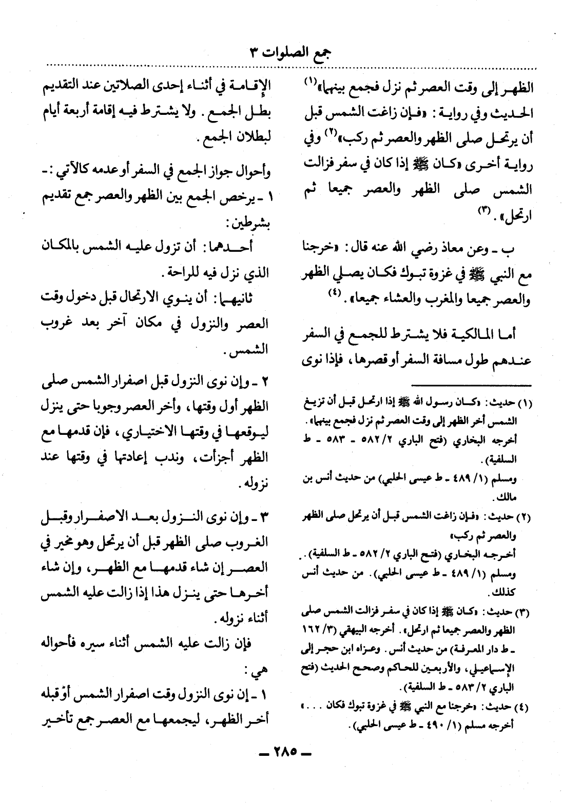 (1) حديث: " كان رسول الله صلى الله عليه وسلم إذا ارتحل قبل أن تزيغ الشمس أخر الظهر إلى وقت العصر ثم نزل فجمع بينهما ". أخرجه البخاري (فتح الباري 2 / 582 - 583 - ط السلفية) . ومسلم (1 / 489 - ط عيسى الحلبي) من حديث أنس بن مالك.