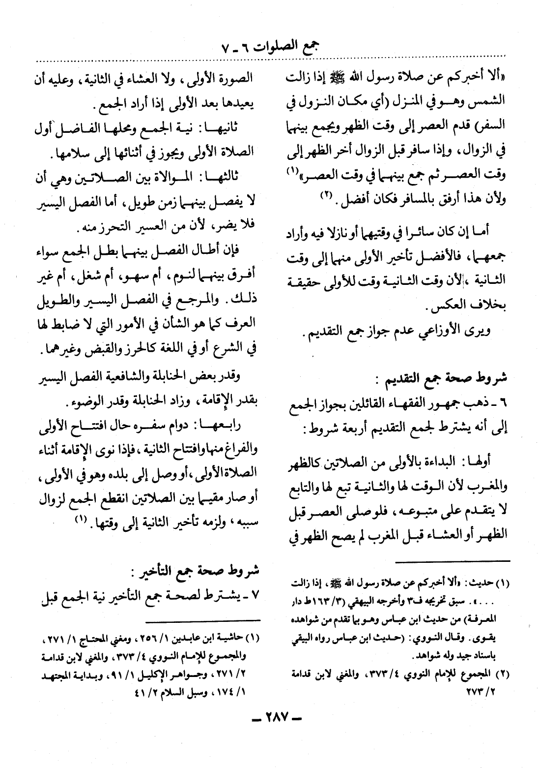 6 - ذَهَبَ جُمْهُورُ الْفُقَهَاءِ الْقَائِلِينَ بِجَوَازِ الْجَمْعِ إِلَى أَنَّهُ يُشْتَرَطُ لِجَمْعِ التَّقْدِيمِ أَرْبَعَةُ شُرُوطٍ: