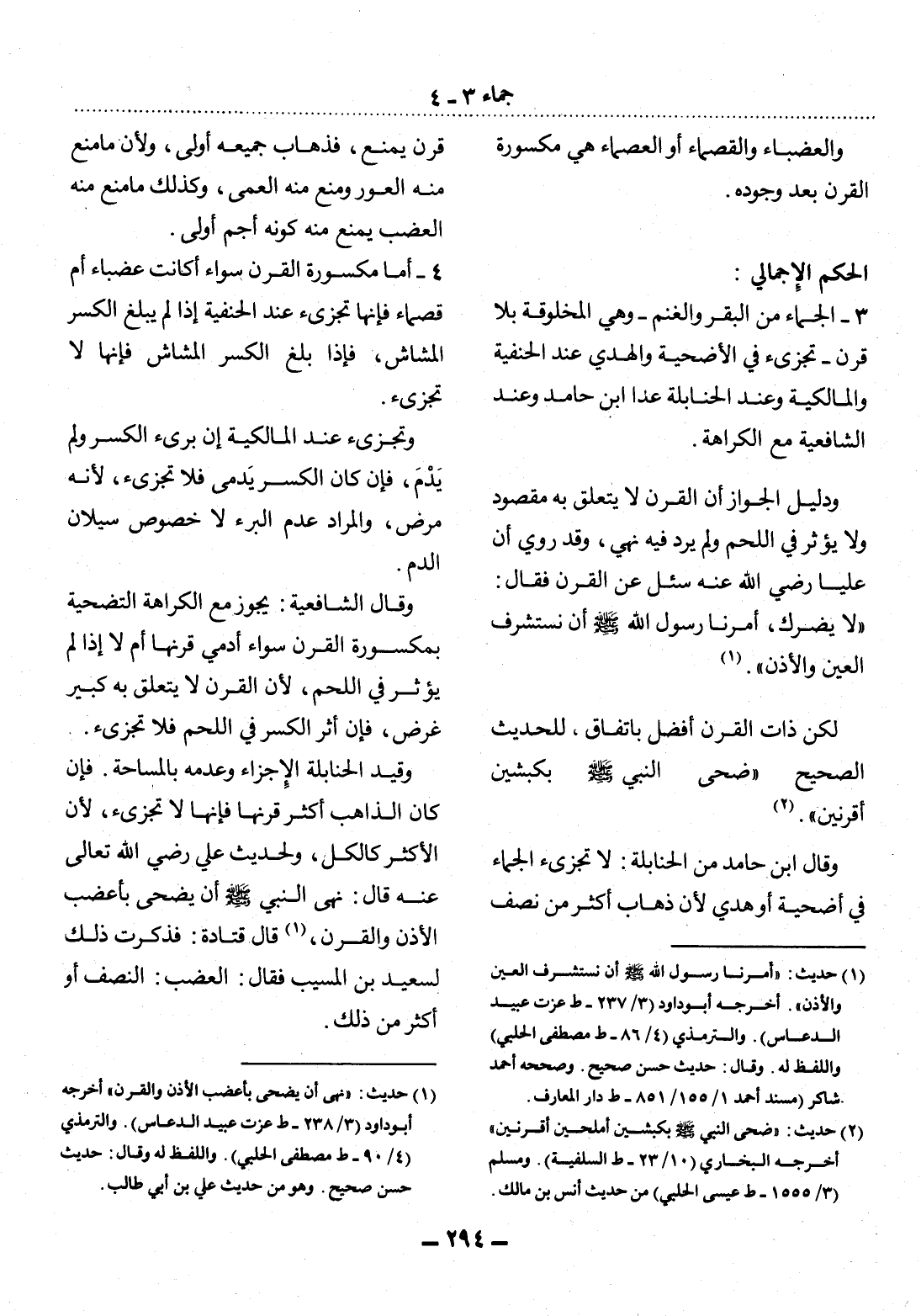 (1) حديث: " نهى أن يضحى بأعضب الأذن والقرن " أخرجه أبو داود (3 / 238 - ط عزت عبيد الدعاس) . والترمذي (4 / 90 - ط مصطفى الحلبي) . واللفظ له وقال: حديث حسن صحيح. وهو من حديث علي بن أبي طالب.