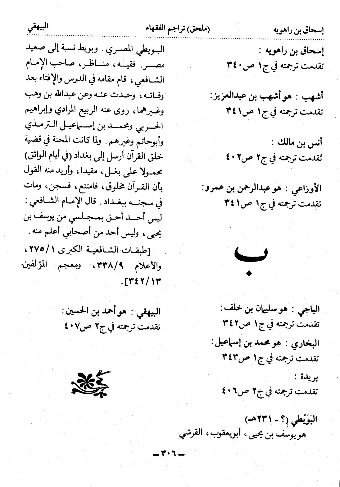 البويطي المصري. وبويط نسبة إلى صعيد مصر. فقيه، مناظر، صاحب الإمام الشافعي، قام مقامه في الدرس والإفتاء بعد وفاته، وحدث عنه وعن عبد الله بن وهب وغيرهما، روى عنه الربيع المرادي وإبراهيم الحربي ومحمد بن إسماعيل الترمذي وأبو حاتم وغيرهم. ولما كانت المحنة في قضية خلق القرآن أرسل إلى بغداد (في أيام الواثق) محمولا على بغل، مقيدا، وأريد منه القول بأن القرآن مخلوق، فامتنع، فسجن، ومات في سجنه ببغداد. قال الإمام الشافعي: ليس أحد أحق بمجلسي من يوسف بن يحيى، وليس أحد من أصحابي أعلم منه. [طبقات الشافعية الكبرى 1 / 275، والأعلام 9 / 338، ومعجم المؤلفين 13 / 342] .