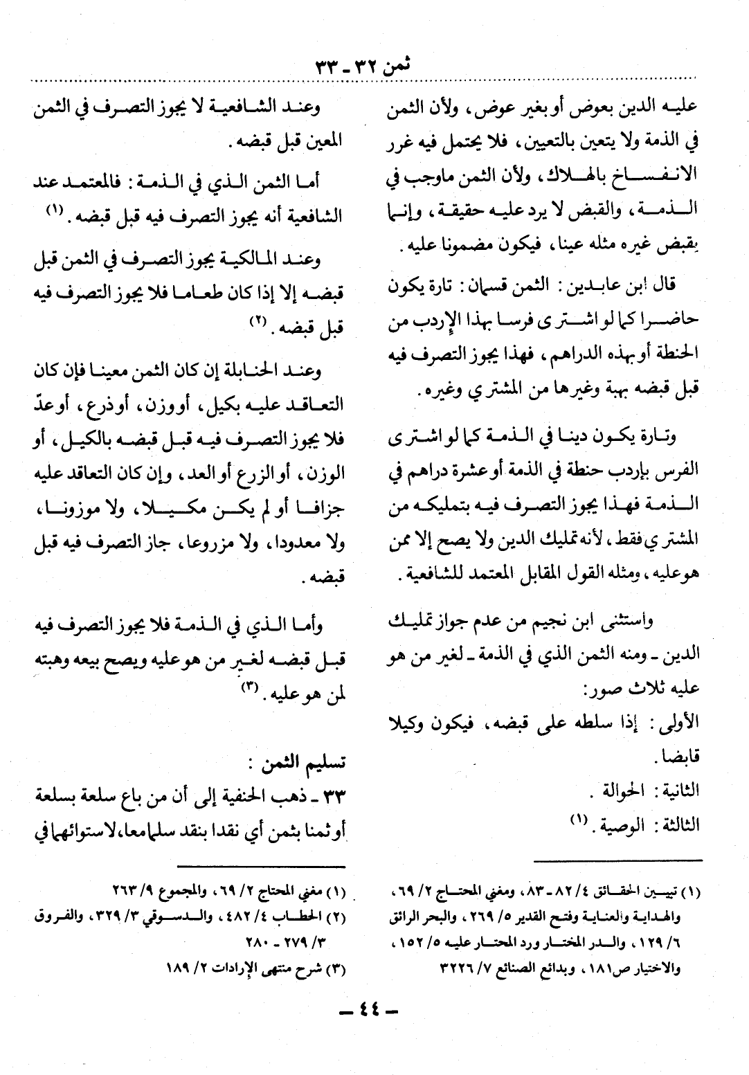 33 - ذَهَبَ الْحَنَفِيَّةُ إِلَى أَنَّ مَنْ بَاعَ سِلْعَةً بِسِلْعَةٍ أَوْ ثَمَنًا بِثَمَنٍ أَيْ نَقْدًا بِنَقْدٍ سُلِّمَا مَعًا، لاِسْتِوَائِهِمَا فِي