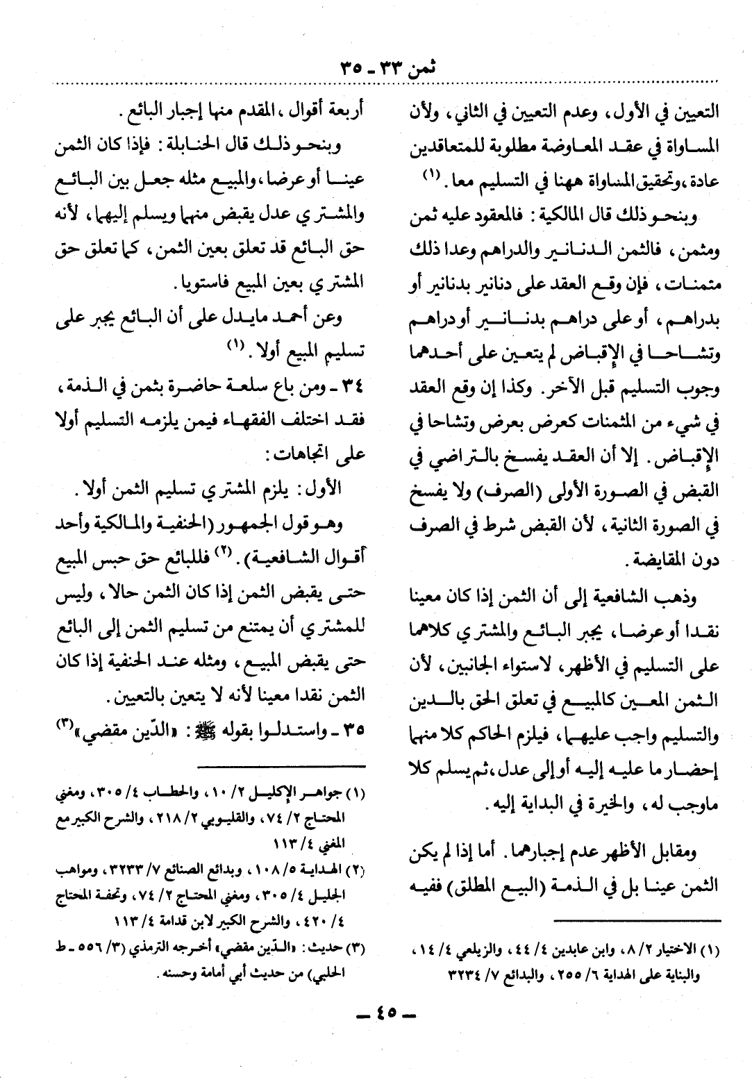 34 - وَمَنْ بَاعَ سِلْعَةً حَاضِرَةً بِثَمَنٍ فِي الذِّمَّةِ، فَقَدِ اخْتَلَفَ الْفُقَهَاءُ فِيمَنْ يَلْزَمُهُ التَّسْلِيمُ أَوَّلاً عَلَى اتِّجَاهَاتٍ: