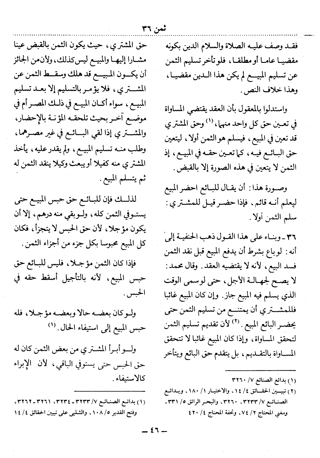 36 - وَبِنَاءً عَلَى هَذَا الْقَوْل ذَهَبَ الْحَنَفِيَّةُ إِلَى أَنَّهُ: لَوْ بَاعَ بِشَرْطِ أَنْ يَدْفَعَ الْمَبِيعَ قَبْل نَقْدِ الثَّمَنِ فَسَدَ الْبَيْعُ، لأَِنَّهُ لاَ يَقْتَضِيهِ الْعَقْدُ. وَقَال مُحَمَّدٌ: لاَ يَصِحُّ لِجَهَالَةِ الأَْجَل، حَتَّى لَوْ سَمَّى الْوَقْتَ الَّذِي يُسَلِّمُ فِيهِ الْمَبِيعَ جَازَ. وَإِنْ كَانَ الْمَبِيعُ غَائِبًا فَلِلْمُشْتَرِي أَنْ يَمْتَنِعَ مِنْ تَسْلِيمِ الثَّمَنِ حَتَّى يُحْضِرَ الْبَائِعُ الْمَبِيعَ؛ (1) لأَِنَّ تَقْدِيمَ تَسْلِيمِ الثَّمَنِ لِتَحَقُّقِ الْمُسَاوَاةِ، وَإِذَا كَانَ الْمَبِيعُ غَائِبًا لاَ تَتَحَقَّقُ الْمُسَاوَاةُ بِالتَّقْدِيمِ، بَل يَتَقَدَّمُ حَقُّ الْبَائِعِ وَيَتَأَخَّرُ