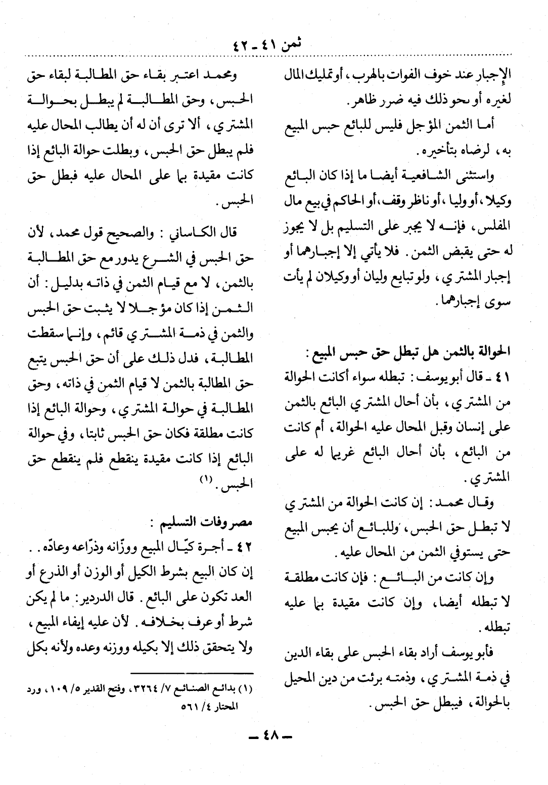 41 - قَال أَبُو يُوسُفَ: تُبْطِلُهُ سَوَاءٌ أَكَانَتِ الْحَوَالَةُ مِنَ الْمُشْتَرِي، بِأَنْ أَحَال الْمُشْتَرِي الْبَائِعَ بِالثَّمَنِ عَلَى إِنْسَانٍ وَقَبِل الْمُحَال عَلَيْهِ الْحَوَالَةَ، أَمْ كَانَتْ مِنَ الْبَائِعِ، بِأَنْ أَحَال الْبَائِعُ غَرِيمًا لَهُ عَلَى الْمُشْتَرِي.
