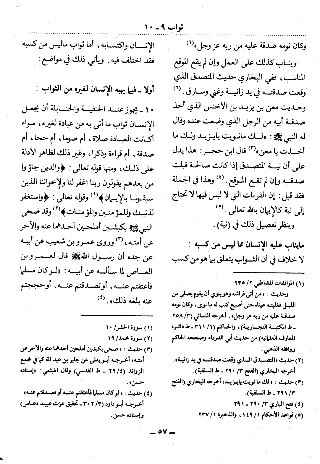(1) الموافقات للشاطبي 2 / 235. وحديث: " من أتى فراشه وهو ينوي أن يقوم يصلي من الليل فغلبته عيناه حتى أصبح كتب له ما نوى، وكان نومه صدقة عليه من ربه عز وجل ". أخرجه النسائي (3 / 258، - ط المكتبة التجارية) ، والحاكم (1 / 311 - ط دائرة المعارف العثمانية) من حديث أبي الدرداء وصححه الحاكم ووافقه الذهبي.