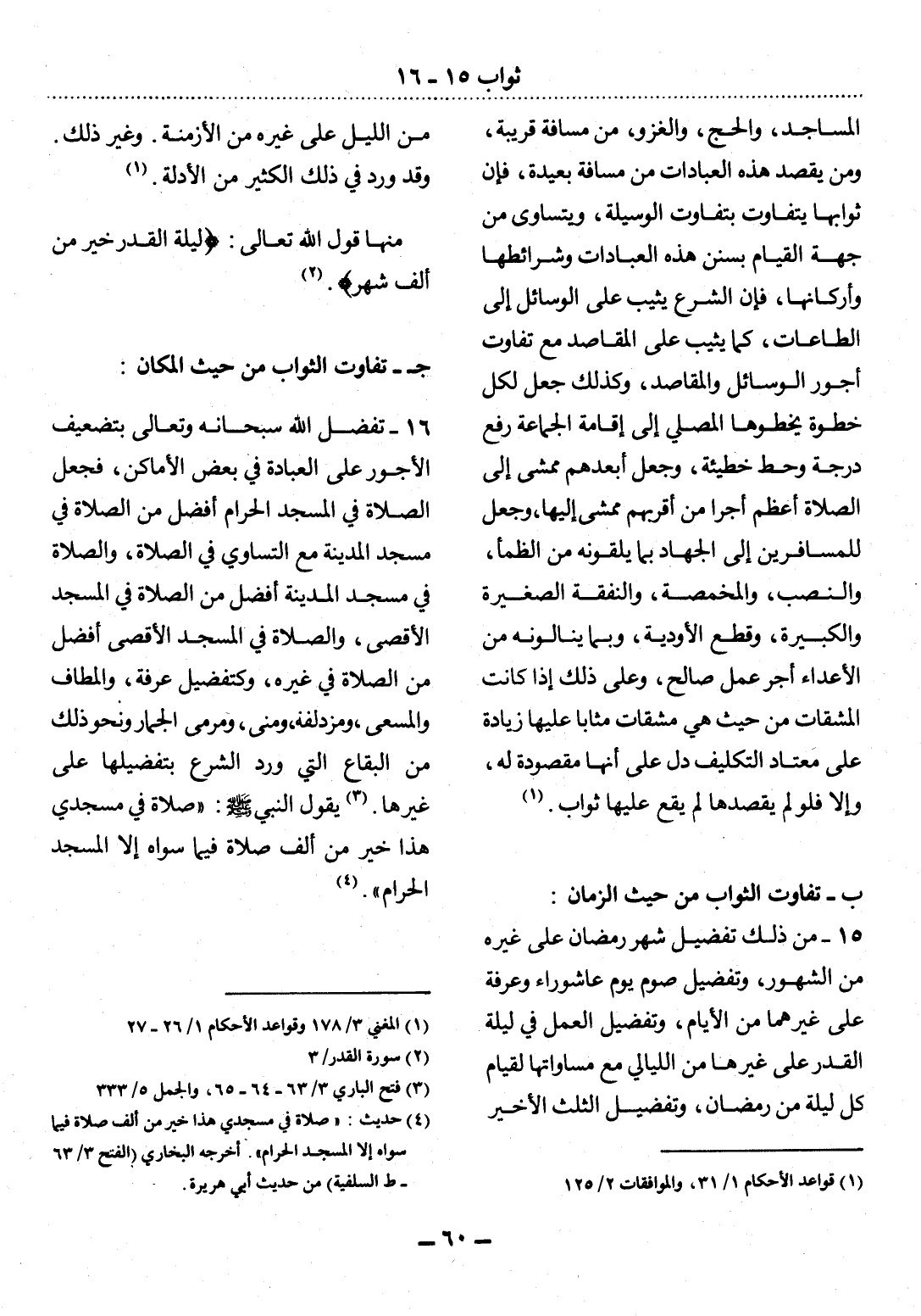 16 - تَفَضَّل اللَّهُ سُبْحَانَهُ وَتَعَالَى بِتَضْعِيفِ الأُْجُورِ عَلَى الْعِبَادَةِ فِي بَعْضِ الأَْمَاكِنِ، فَجَعَل الصَّلاَةَ فِي الْمَسْجِدِ الْحَرَامِ أَفْضَل مِنَ الصَّلاَةِ فِي مَسْجِدِ الْمَدِينَةِ مَعَ التَّسَاوِي فِي الصَّلاَةِ، وَالصَّلاَةَ فِي مَسْجِدِ الْمَدِينَةِ أَفْضَل مِنَ الصَّلاَةِ فِي الْمَسْجِدِ الأَْقْصَى، وَالصَّلاَةَ فِي الْمَسْجِدِ الأَْقْصَى أَفْضَل مِنَ الصَّلاَةِ فِي غَيْرِهِ، وَكَتَفْضِيل عَرَفَةَ، وَالْمَطَافِ وَالْمَسْعَى وَمُزْدَلِفَةَ، وَمِنًى، وَمَرْمَى الْجِمَارِ وَنَحْوِ ذَلِكَ مِنَ الْبِقَاعِ الَّتِي وَرَدَ الشَّرْعُ بِتَفْضِيلِهَا عَلَى غَيْرِهَا (3) . يَقُول النَّبِيُّ صَلَّى اللَّهُ عَلَيْهِ وَسَلَّمَ: صَلاَةٌ فِي مَسْجِدِي هَذَا خَيْرٌ مِنْ أَلْفِ صَلاَةٍ فِيمَا سِوَاهُ إِلاَّ الْمَسْجِدَ الْحَرَامَ (4) .