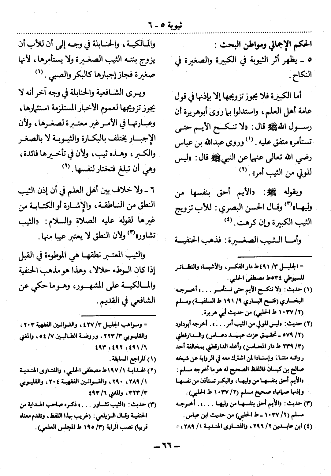 5 - يَظْهَرُ أَثَرُ الثُّيُوبَةِ فِي الْكَبِيرَةِ وَالصَّغِيرَةِ فِي النِّكَاحِ.