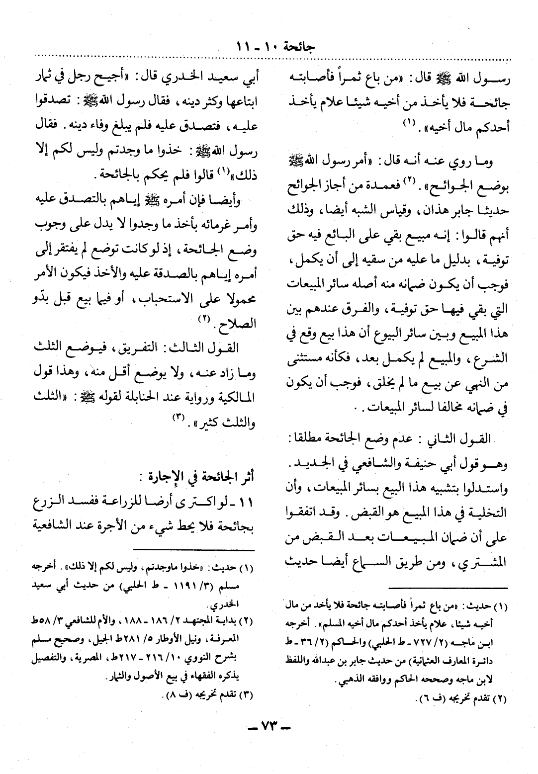 (1) حديث: " من باع ثمرا فأصابته جائحة فلا يأخذ من مال أخيه شيئا، علام يأخذ أحدكم مال أخيه المسلم ". أخرجه ابن ماجه (2 / 727 - ط الحلبي) والحاكم (2 / 36 - ط دائرة المعارف العثمانية) من حديث جابر بن عبد الله واللفظ لابن ماجه وصححه الحاكم ووافقه الذهبي.