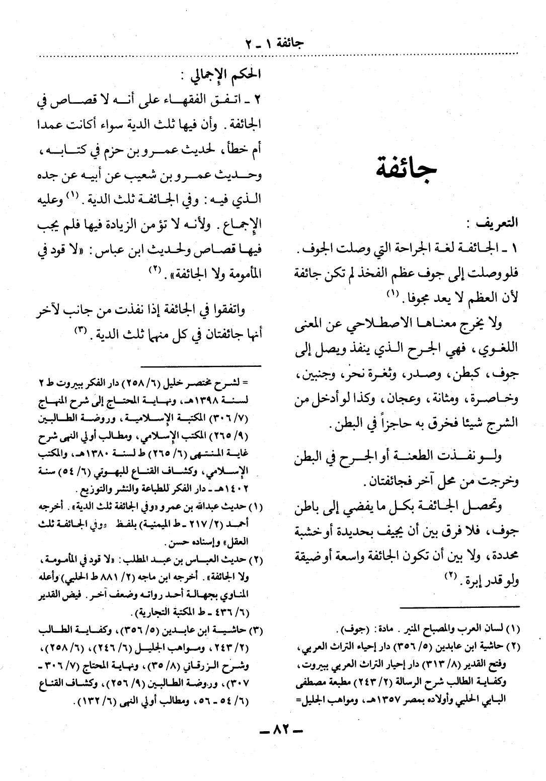 (2) حديث العباس بن عبد المطلب: " لا قود في المأمومة، ولا الجائفة ". أخرجه ابن ماجه (2 / 881 ط الحلبي) وأعله المناوي بجهالة أحد رواته وضعف آخر. فيض القدير (6 / 436 - ط المكتبة التجارية) .