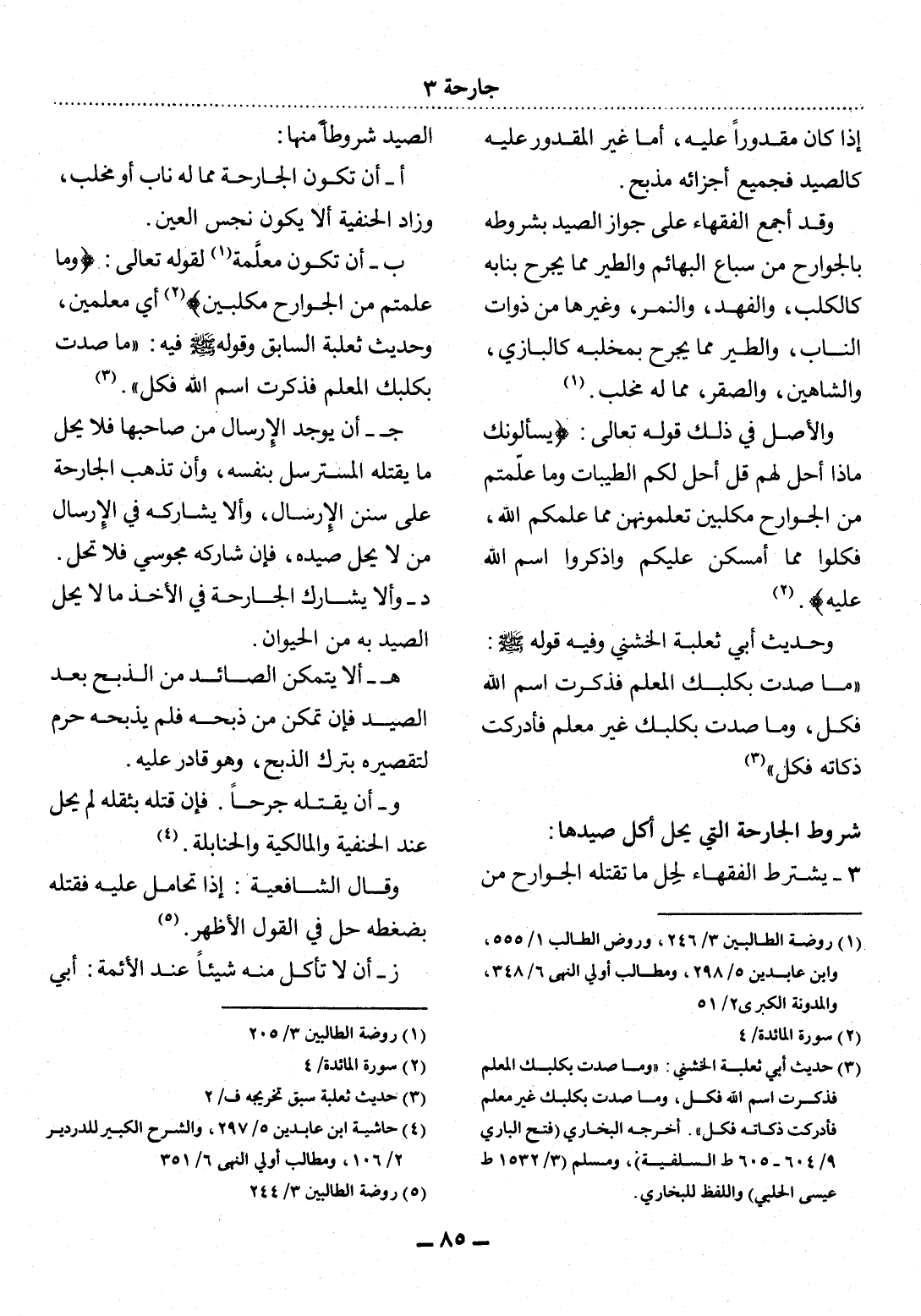 ب - أَنْ تَكُونَ مُعَلَّمَةً (1) لِقَوْلِهِ تَعَالَى: {وَمَا عَلَّمْتُمْ مِنَ الْجَوَارِحِ مُكَلِّبِينَ (2) } أَيْ مُعَلِّمِينَ، وَحَدِيثُ ثَعْلَبَةَ السَّابِقُ وَقَوْلُهُ صَلَّى اللَّهُ عَلَيْهِ وَسَلَّمَ فِيهِ: مَا صِدْتَ بِكَلْبِكَ الْمُعَلَّمِ فَذَكَرْتَ اسْمَ اللَّهِ فَكُل (3) .