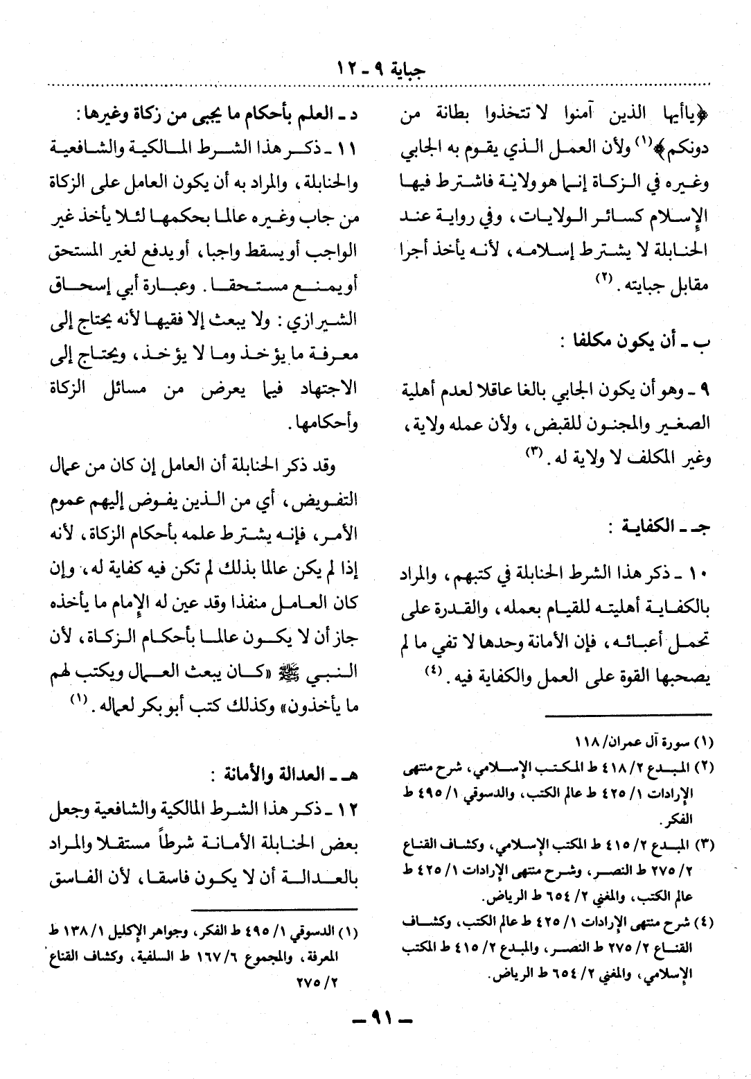 11 - ذَكَرَ هَذَا الشَّرْطَ الْمَالِكِيَّةُ وَالشَّافِعِيَّةُ وَالْحَنَابِلَةُ، وَالْمُرَادُ بِهِ أَنْ يَكُونَ الْعَامِل عَلَى الزَّكَاةِ مِنْ جَابٍ وَغَيْرِهِ عَالِمًا بِحُكْمِهَا لِئَلاَّ يَأْخُذَ غَيْرَ الْوَاجِبِ أَوْ يُسْقِطَ وَاجِبًا، أَوْ يَدْفَعَ لِغَيْرِ الْمُسْتَحِقِّ أَوْ يَمْنَعَ مُسْتَحِقًّا. وَعِبَارَةُ أَبِي إِسْحَاقَ الشِّيرَازِيِّ: وَلاَ يَبْعَثُ إِلاَّ فَقِيهًا لأَِنَّهُ يَحْتَاجُ إِلَى مَعْرِفَةِ مَا يُؤْخَذُ وَمَا لاَ يُؤْخَذُ، وَيَحْتَاجُ إِلَى الاِجْتِهَادِ فِيمَا يَعْرِضُ مِنْ مَسَائِل الزَّكَاةِ وَأَحْكَامِهَا.