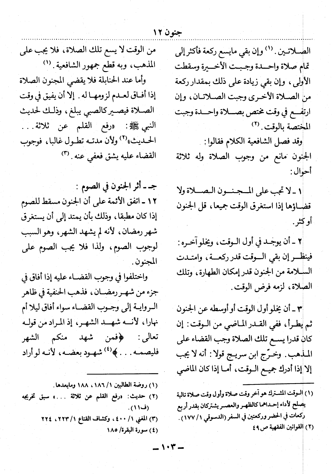 1 - لاَ تَجِبُ عَلَى الْمَجْنُونِ الصَّلاَةُ وَلاَ قَضَاؤُهَا إِذَا اسْتَغْرَقَ الْوَقْتَ جَمِيعًا، قَل الْجُنُونُ أَوْ كَثُرَ.