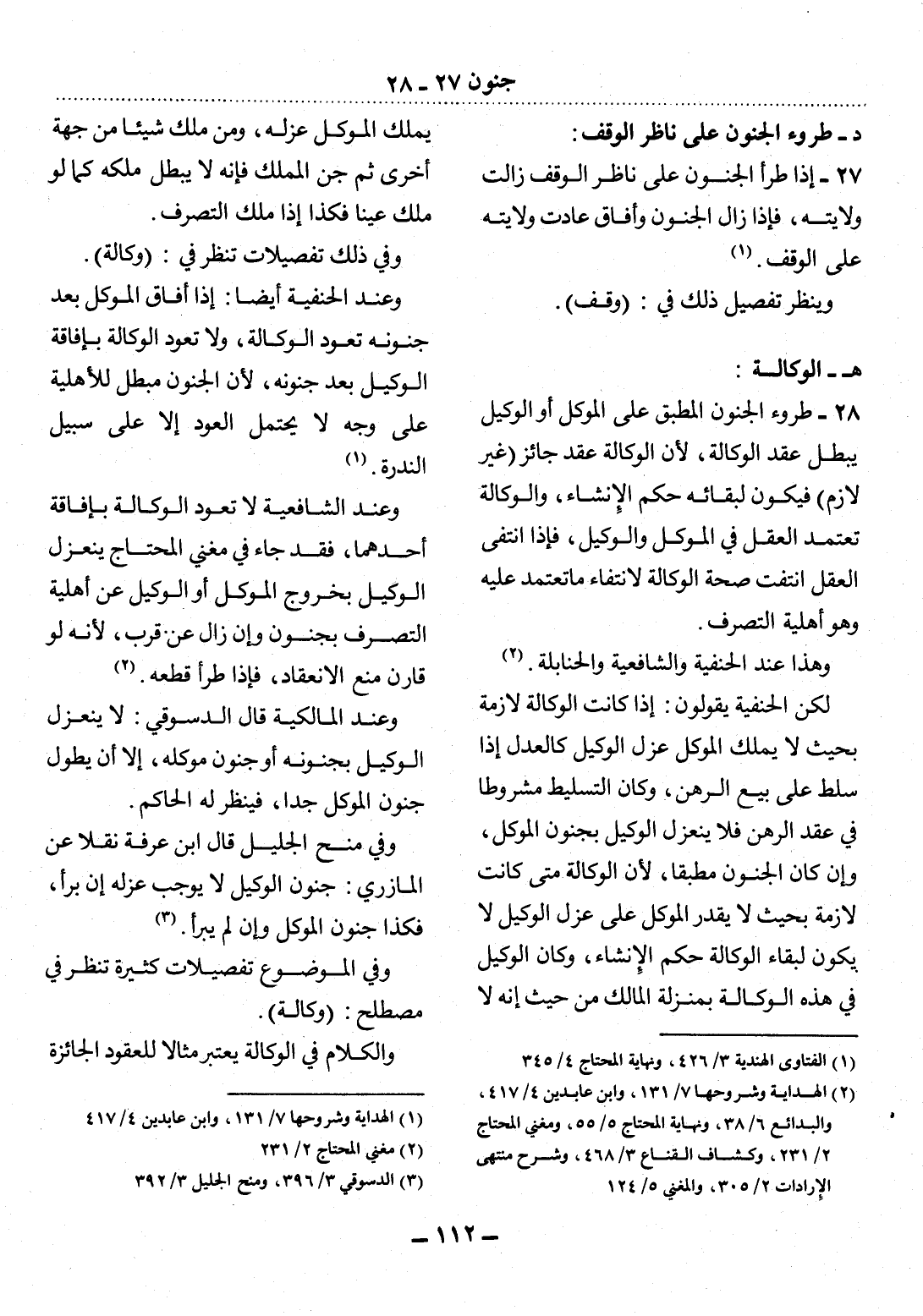 28 - طُرُوءُ الْجُنُونِ الْمُطْبِقِ عَلَى الْمُوَكِّل أَوِ الْوَكِيل يُبْطِل عَقْدَ الْوَكَالَةِ؛ لأَِنَّ الْوَكَالَةَ عَقْدٌ جَائِزٌ (غَيْرُ لاَزِمٍ) فَيَكُونُ لِبَقَائِهِ حُكْمُ الإِْنْشَاءِ، وَالْوَكَالَةُ تَعْتَمِدُ الْعَقْل فِي الْمُوَكِّل وَالْوَكِيل، فَإِذَا انْتَفَى الْعَقْل انْتَفَتْ صِحَّةُ الْوَكَالَةِ لاِنْتِفَاءِ مَا تَعْتَمِدُ عَلَيْهِ وَهُوَ أَهْلِيَّةُ التَّصَرُّفِ، وَهَذَا عِنْدَ الْحَنَفِيَّةِ وَالشَّافِعِيَّةِ وَالْحَنَابِلَةِ. (2)