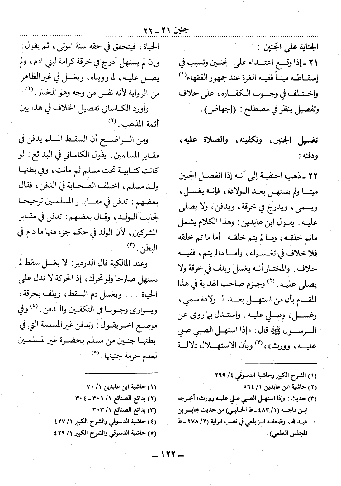 22 - ذَهَبَ الْحَنَفِيَّةُ إِلَى أَنَّهُ إِذَا انْفَصَل الْجَنِينُ مَيِّتًا وَلَمْ يَسْتَهِل بَعْدَ الْوِلاَدَةِ، فَإِنَّهُ يُغَسَّل، وَيُسَمَّى، وَيُدْرَجُ فِي خِرْقَةٍ، وَيُدْفَنُ، وَلاَ يُصَلَّى عَلَيْهِ. يَقُول ابْنُ عَابِدِينَ: وَهَذَا الْكَلاَمُ يَشْمَل مَا تَمَّ خَلْقُهُ، وَمَا لَمْ يَتِمَّ خَلْقُهُ. أَمَّا مَا تَمَّ خَلْقُهُ فَلاَ خِلاَفَ فِي تَغْسِيلِهِ، وَأَمَّا مَا لَمْ يَتِمَّ، فَفِيهِ خِلاَفٌ. وَالْمُخْتَارُ أَنَّهُ يُغَسَّل وَيُلَفُّ فِي خِرْقَةٍ وَلاَ يُصَلَّى عَلَيْهِ (2) . وَجَزَمَ صَاحِبُ الْهِدَايَةِ فِي هَذَا الْمَقَامِ بِأَنَّ مَنِ اسْتَهَل بَعْدَ الْوِلاَدَةِ سُمِّيَ، وَغُسِّل، وَصُلِّيَ عَلَيْهِ. وَاسْتَدَل بِمَا رُوِيَ عَنِ الرَّسُول صَلَّى اللَّهُ عَلَيْهِ وَسَلَّمَ قَال: إِذَا اسْتَهَل الصَّبِيُّ صُلِّيَ عَلَيْهِ، وَوَرِثَ (3) ، وَبِأَنَّ الاِسْتِهْلاَل دَلاَلَةُ
