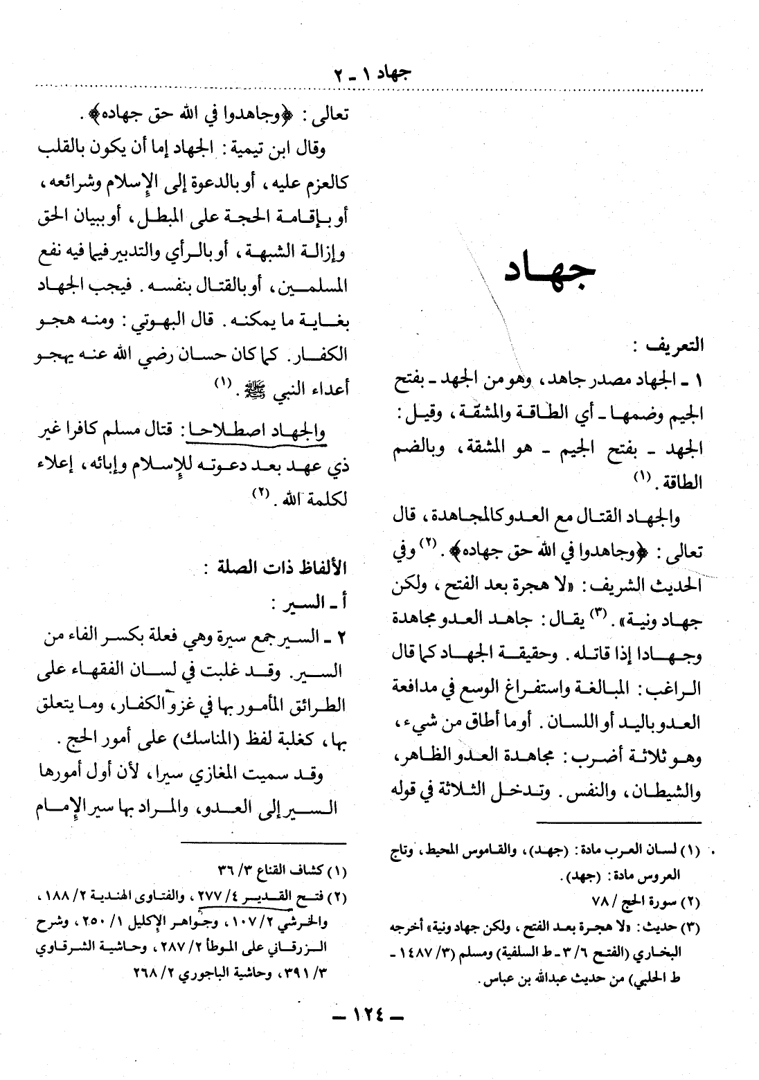 1 - الْجِهَادُ مَصْدَرُ جَاهَدَ، وَهُوَ مِنَ الْجَهْدِ - بِفَتْحِ الْجِيمِ وَضَمِّهَا - أَيِ الطَّاقَةِ وَالْمَشَقَّةِ، وَقِيل: الْجَهْدُ - بِفَتْحِ الْجِيمِ - هُوَ الْمَشَقَّةُ، وَبِالضَّمِّ الطَّاقَةُ (1) .