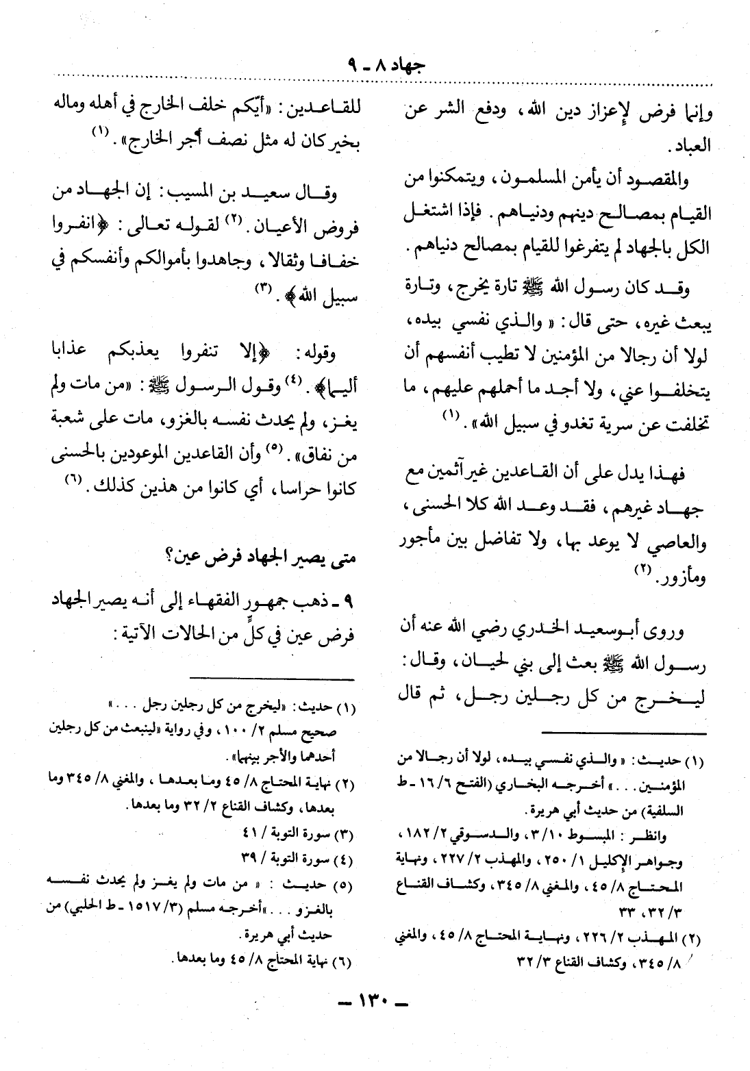 وَقَوْلُهُ: {إِلاَّ تَنْفِرُوا يُعَذِّبْكُمْ عَذَابًا أَلِيمًا (4) } . وَقَوْل الرَّسُول صَلَّى اللَّهُ عَلَيْهِ وَسَلَّمَ: مَنْ مَاتَ وَلَمْ يَغْزُ، وَلَمْ يُحَدِّثْ نَفْسَهُ بِالْغَزْوِ، مَاتَ عَلَى شُعْبَةٍ مِنْ نِفَاقٍ (5) . وَأَنَّ الْقَاعِدِينَ الْمَوْعُودِينَ بِالْحُسْنَى كَانُوا حُرَّاسًا، أَيْ كَانُوا مِنْ هَذَيْنِ كَذَلِكَ (6) .