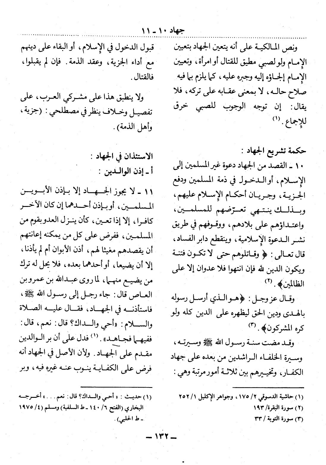 11 - لاَ يَجُوزُ الْجِهَادُ إِلاَّ بِإِذْنِ الأَْبَوَيْنِ الْمُسْلِمَيْنِ، أَوْ بِإِذْنِ أَحَدِهِمَا إِنْ كَانَ الآْخَرُ كَافِرًا، إِلاَّ إِذَا تَعَيَّنَ، كَأَنْ يَنْزِل الْعَدُوُّ بِقَوْمٍ مِنَ الْمُسْلِمِينَ، فَفَرْضٌ عَلَى كُل مَنْ يُمْكِنُهُ إِعَانَتُهُمْ أَنْ يَقْصِدَهُمْ مُغِيثًا لَهُمْ، أَذِنَ الأَْبَوَانِ أَمْ لَمْ يَأْذَنَا، إِلاَّ أَنْ يَضِيعَا، أَوْ أَحَدُهُمَا بَعْدَهُ، فَلاَ يَحِل لَهُ تَرْكُ مَنْ يَضِيعُ مِنْهُمَا؛ لِمَا رَوَى عَبْدُ اللَّهِ بْنُ عَمْرِو بْنِ الْعَاصِ قَال: جَاءَ رَجُلٌ إِلَى رَسُول اللَّهِ صَلَّى اللَّهُ عَلَيْهِ وَسَلَّمَ فَاسْتَأْذَنَهُ فِي الْجِهَادِ، فَقَال عَلَيْهِ الصَّلَاةُ وَالسَّلَامُ: أَحَيٌّ وَالِدَاكَ؟ قَال: نَعَمْ، قَال: فَفِيهِمَا فَجَاهِدْ (1) . فَدَل عَلَى أَنَّ بِرَّ الْوَالِدَيْنِ مُقَدَّمٌ عَلَى الْجِهَادِ. وَلأَِنَّ الأَْصْل فِي الْجِهَادِ أَنَّهُ فَرْضٌ عَلَى الْكِفَايَةِ يَنُوبُ عَنْهُ غَيْرُهُ فِيهِ، وَبِرُّ