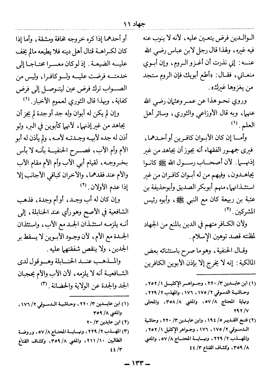وَأَمَّا إِنْ كَانَ الأَْبَوَانِ كَافِرَيْنِ أَوْ أَحَدُهُمَا، فَيَرَى جُمْهُورُ الْفُقَهَاءِ أَنَّهُ يَجُوزُ أَنْ يُجَاهِدَ مِنْ غَيْرِ إِذْنِهِمَا؛ لأَِنَّ أَصْحَابَ رَسُول اللَّهِ صَلَّى اللَّهُ عَلَيْهِ وَسَلَّمَ كَانُوا يُجَاهِدُونَ، وَفِيهِمْ مَنْ لَهُ أَبَوَانِ كَافِرَانِ مِنْ غَيْرِ اسْتِئْذَانِهِمَا، مِنْهُمْ أَبُو بَكْرٍ الصِّدِّيقُ وَأَبُو حُذَيْفَةَ بْنُ عُتْبَةَ بْنِ رَبِيعَةَ كَانَ مَعَ النَّبِيِّ صَلَّى اللَّهُ عَلَيْهِ وَسَلَّمَ وَأَبُوهُ رَئِيسُ الْمُشْرِكِينَ (2) .