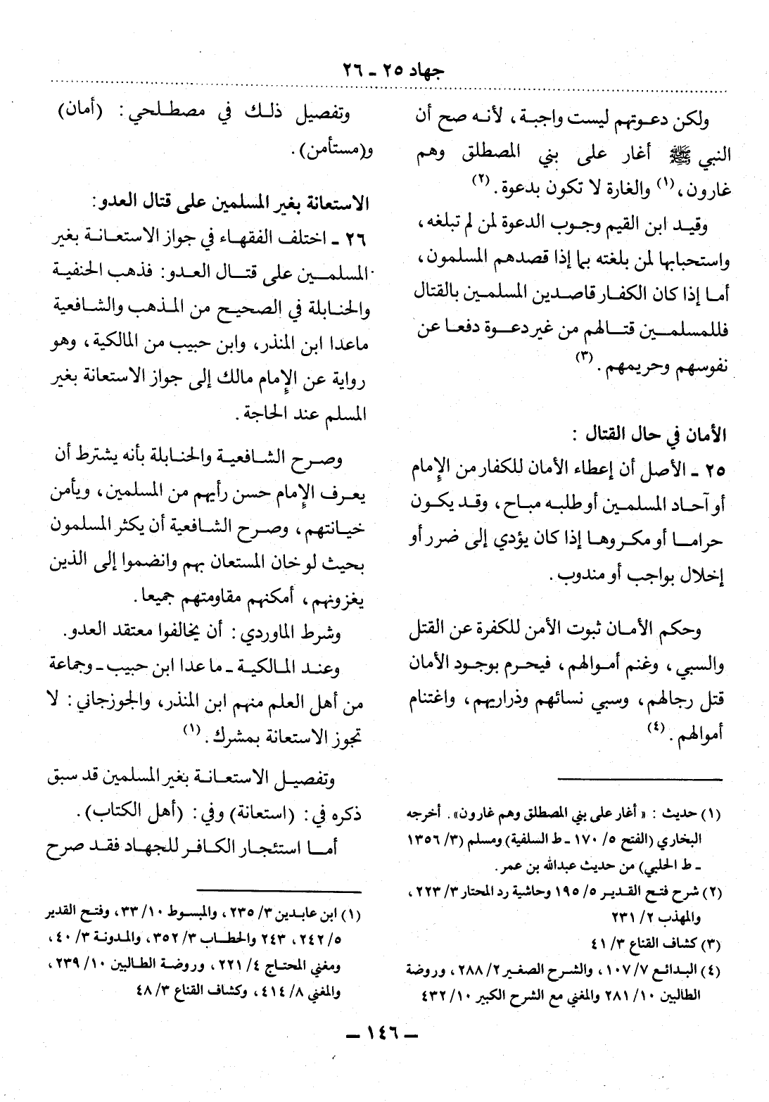 26 - اخْتَلَفَ الْفُقَهَاءُ فِي جَوَازِ الاِسْتِعَانَةِ بِغَيْرِ الْمُسْلِمِينَ عَلَى قِتَال الْعَدُوِّ: فَذَهَبَ الْحَنَفِيَّةُ وَالْحَنَابِلَةُ فِي الصَّحِيحِ مِنَ الْمَذْهَبِ وَالشَّافِعِيَّةُ مَا عَدَا ابْنَ الْمُنْذِرِ، وَابْنَ حَبِيبٍ مِنَ الْمَالِكِيَّةِ، وَهُوَ رِوَايَةٌ عَنِ الإِْمَامِ مَالِكٍ إِلَى جَوَازِ الاِسْتِعَانَةِ بِغَيْرِ الْمُسْلِمِ عِنْدَ الْحَاجَةِ.