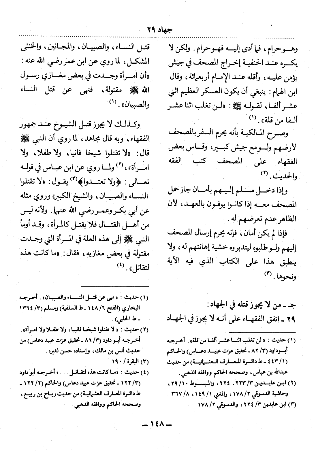 (1) حديث: " نهى عن قتل النساء والصبيان ". أخرجه البخاري (الفتح 6 / 148 - ط السلفية) ومسلم (3 / 1364 - ط الحلبي) .