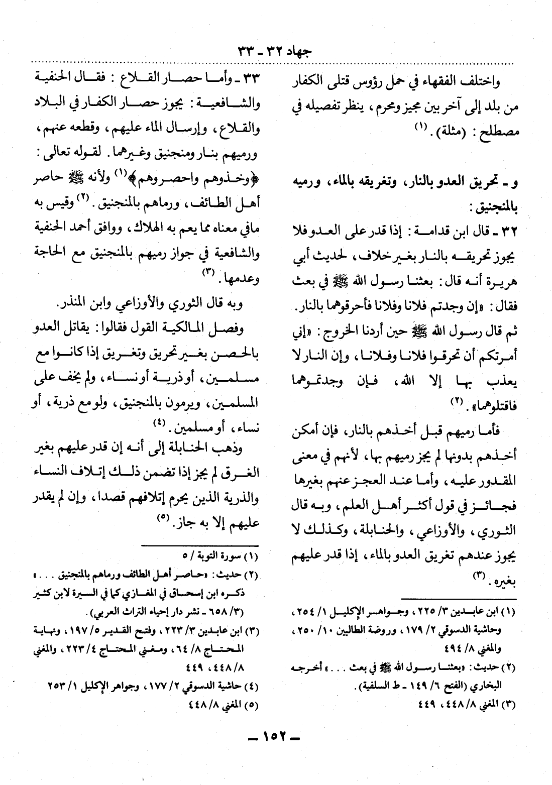 33 - وَأَمَّا حِصَارُ الْقِلاَعِ: فَقَال الْحَنَفِيَّةُ وَالشَّافِعِيَّةُ: يَجُوزُ حِصَارُ الْكُفَّارِ فِي الْبِلاَدِ وَالْقِلاَعِ، وَإِرْسَال الْمَاءِ عَلَيْهِمْ، وَقَطْعُهُ عَنْهُمْ، وَرَمْيُهُمْ بِنَارٍ وَمَنْجَنِيقٍ وَغَيْرِهِمَا؛ لِقَوْلِهِ تَعَالَى: {وَخُذُوهُمْ وَاحْصُرُوهُمْ (1) } وَلأَِنَّهُ صَلَّى اللَّهُ عَلَيْهِ وَسَلَّمَ حَاصَرَ أَهْل الطَّائِفِ، وَرَمَاهُمْ بِالْمَنْجَنِيقِ (2) . وَقِيسَ بِهِ مَا فِي مَعْنَاهُ مِمَّا يَعُمُّ بِهِ الْهَلاَكُ، وَوَافَقَ أَحْمَدُ الْحَنَفِيَّةَ وَالشَّافِعِيَّةَ فِي جَوَازِ رَمْيِهِمْ بِالْمَنْجَنِيقِ مَعَ الْحَاجَةِ وَعَدَمِهَا (3) ،
