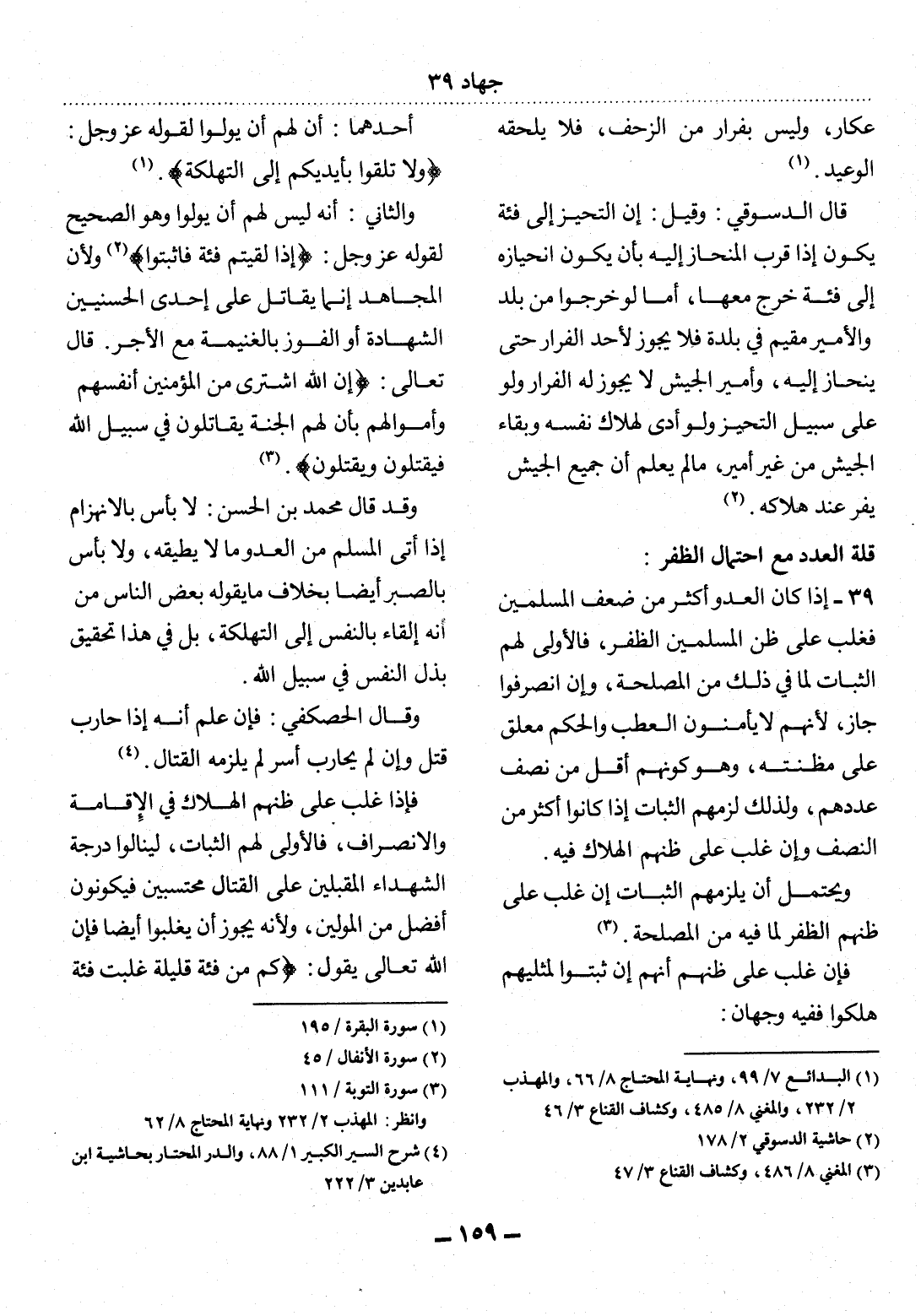39 - إِذَا كَانَ الْعَدُوُّ أَكْثَرَ مِنْ ضِعْفِ الْمُسْلِمِينَ فَغَلَبَ عَلَى ظَنِّ الْمُسْلِمِينَ الظَّفَرُ، فَالأَْوْلَى لَهُمُ الثَّبَاتُ لِمَا فِي ذَلِكَ مِنَ الْمَصْلَحَةِ، وَإِنِ انْصَرَفُوا جَازَ؛ لأَِنَّهُمْ لاَ يَأْمَنُونَ الْعَطَبَ وَالْحُكْمُ مُعَلَّقٌ عَلَى مَظِنَّتِهِ، وَهُوَ كَوْنُهُمْ أَقَل مِنْ نِصْفِ عَدَدِهِمْ، وَلِذَلِكَ لَزِمَهُمُ الثَّبَاتُ إِذَا كَانُوا أَكْثَرَ مِنَ النِّصْفِ وَإِنْ غَلَبَ عَلَى ظَنِّهِمُ الْهَلاَكُ فِيهِ.