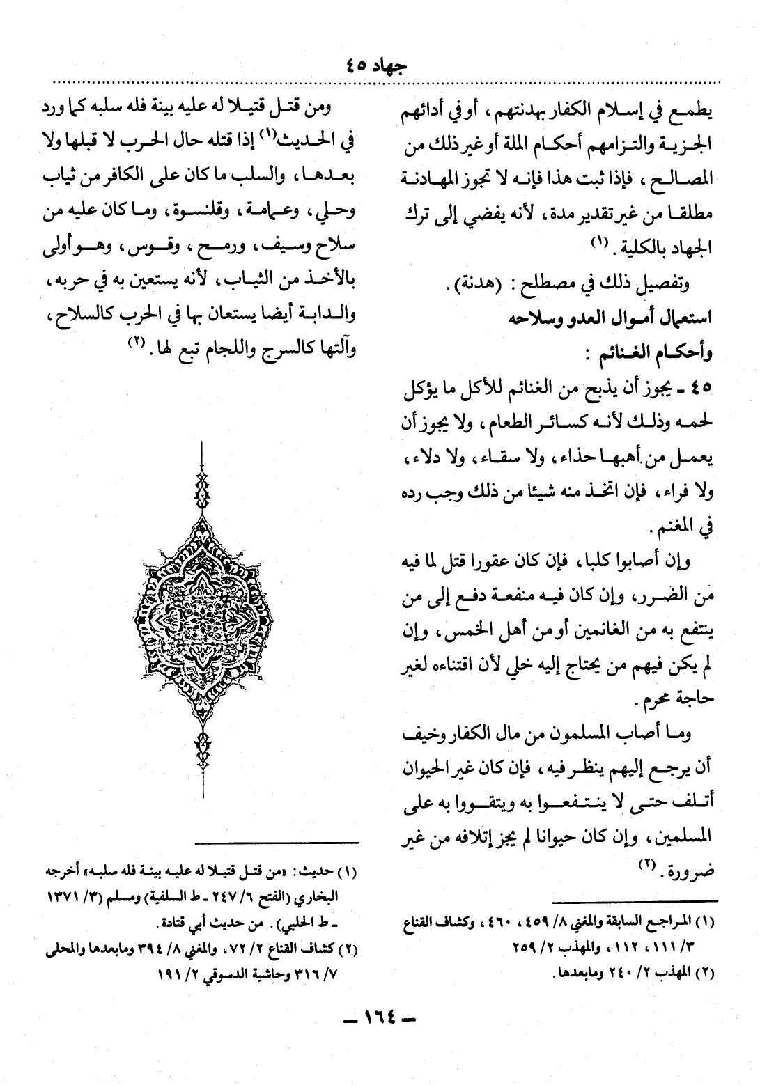 45 - يَجُوزُ أَنْ يُذْبَحَ مِنَ الْغَنَائِمِ لِلأَْكْل مَا يُؤْكَل لَحْمُهُ وَذَلِكَ لأَِنَّهُ كَسَائِرِ الطَّعَامِ، وَلاَ يَجُوزُ أَنْ يُعْمَل مِنْ أُهُبِهَا حِذَاءً، وَلاَ سِقَاءً، وَلاَ دِلاَءً، وَلاَ فِرَاءً، فَإِنِ اتَّخَذَ مِنْهُ شَيْئًا مِنْ ذَلِكَ وَجَبَ رَدُّهُ فِي الْمَغْنَمِ.