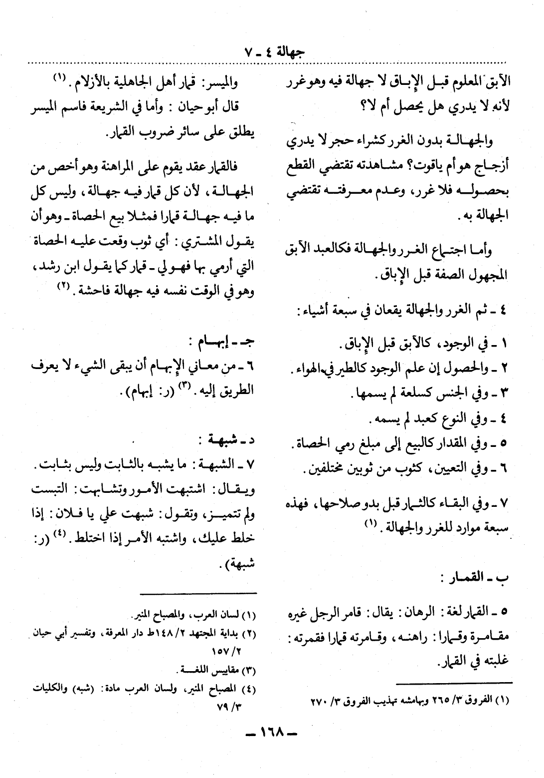 4 - ثُمَّ الْغَرَرُ وَالْجَهَالَةُ يَقَعَانِ فِي سَبْعَةِ أَشْيَاءَ: