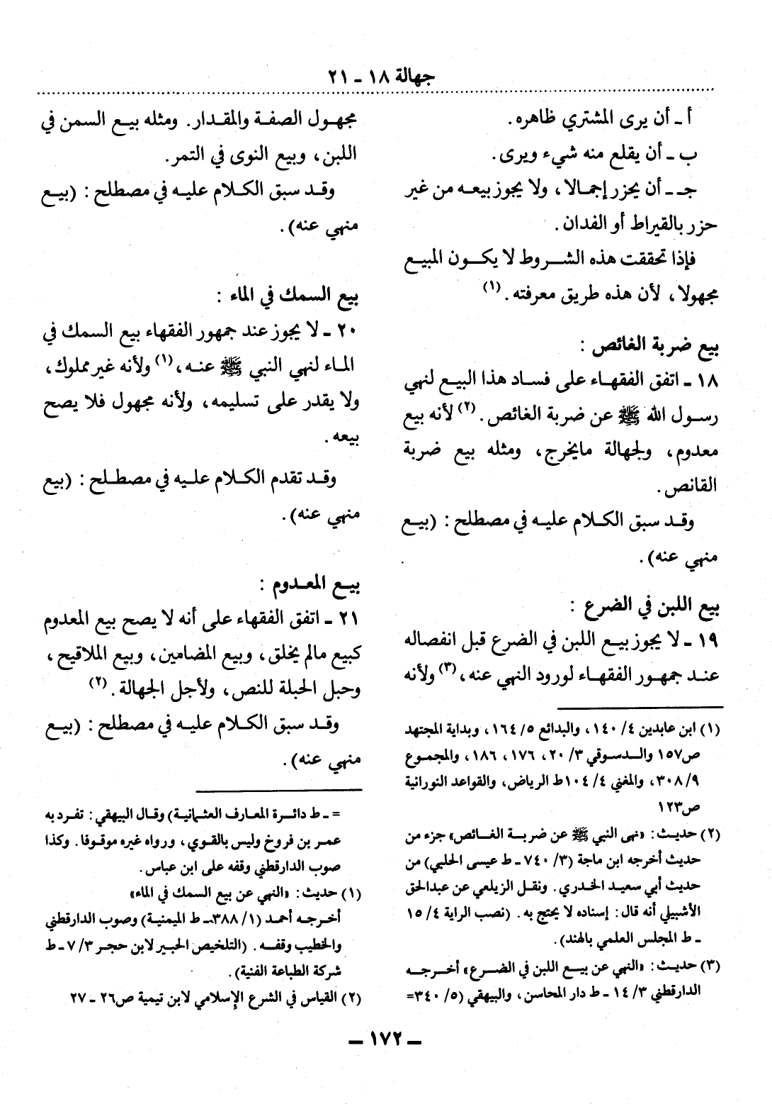 (3) حديث: " النهي عن بيع اللبن في الضرع " أخرجه الدارقطني 3 / 14 - ط دار المحاسن، والبيهقي (5 / 340 - ط دائرة المعارف العثمانية) وقال البيهقي: تفرد به عمر بن فروخ وليس بالقوي، ورواه غيره موقوفا. وكذا صوب الدارقطني وقفه على ابن عباس.